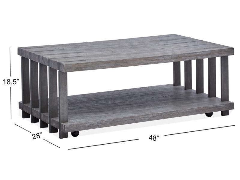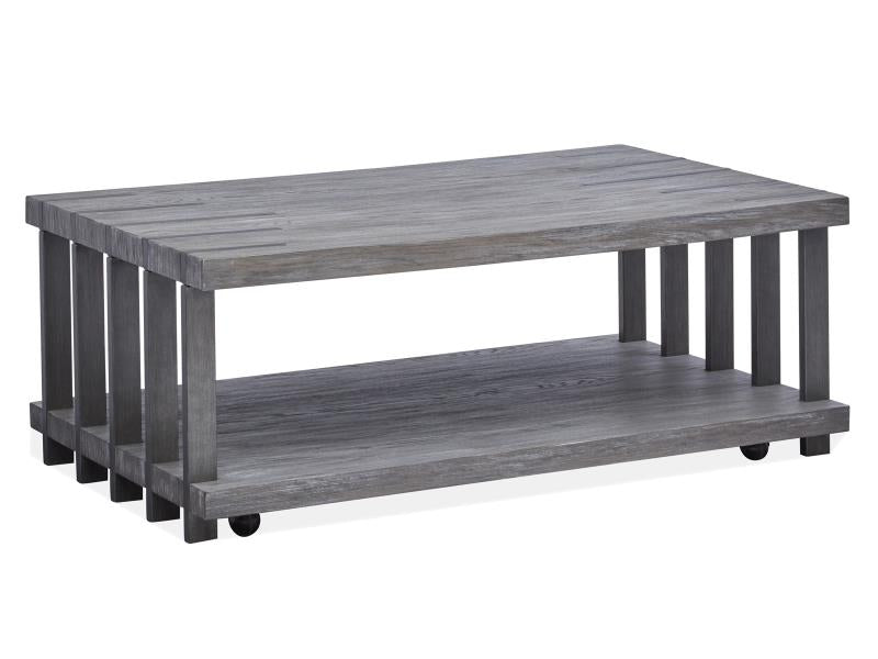 Eldridge - Rectangular Cocktail Table With Casters. Wood top. 1 fixed wood shelf at the bottom. Metal with hand painting legs. Levelers. Casters.