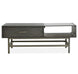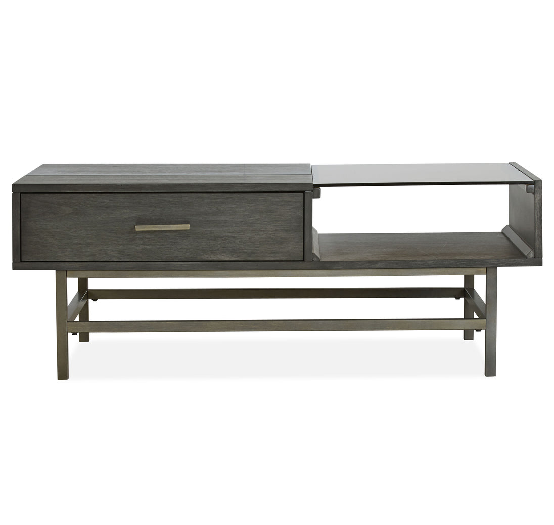 Walnut veneers; Amber glass and pewter metal combine for retro appeal in Fulton. A decidedly ìmodî design aesthetic is created as the wood table cases extend beyond the square tubular; pewter finished metal base frames; appearing to float with finesse. The outstanding cocktail table features a split top with amber glass on the right; revealing an open storage compartment while the left wooden top lifts to accommodate true 1970ís era TV dinners and affords storage beneath. Bar pulls in matching Pewter adorn the front of the two drawer console; complete with floating wood lower shelf; while the rectangular end table repeats with a single drawer and lower shelf for chairside convenience.