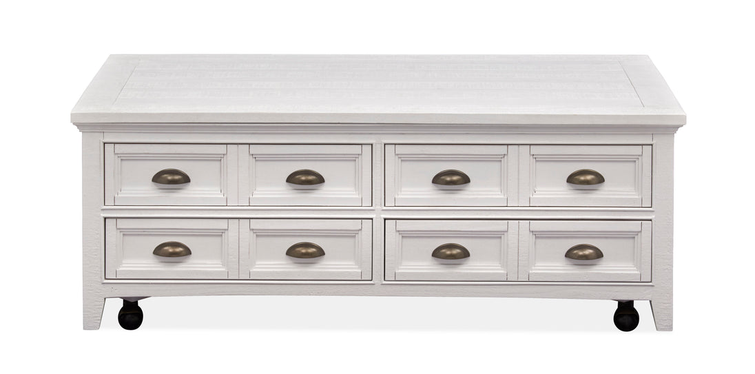 Heron Cove - Lift Top Storage Cocktail Table With Casters. 1 lift top. 2 drawers with appearance of 8 drawers ,including 1 top faux drawer. Tinted drawers with french dovetail in front & english in back. Side mount ball bearing guides. Casters. Floor protectors.