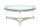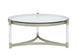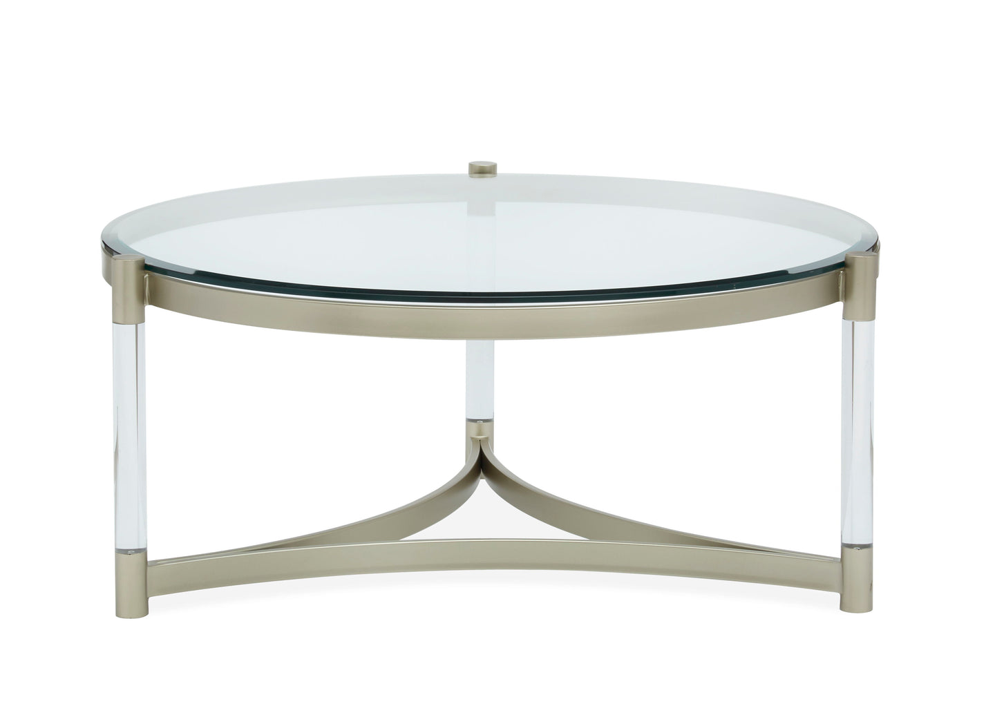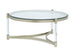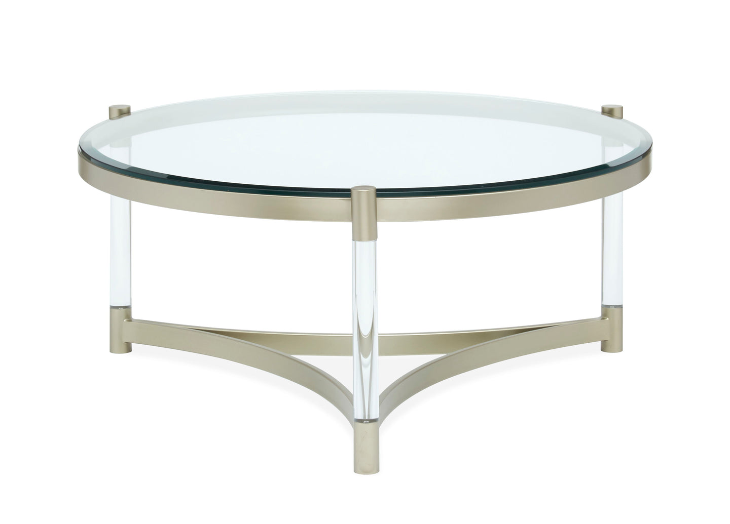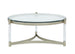 Silas - Round Cocktail Table. 10mm tempered clear glass with flat edge. Metal frame. Acrylic legs.