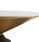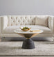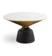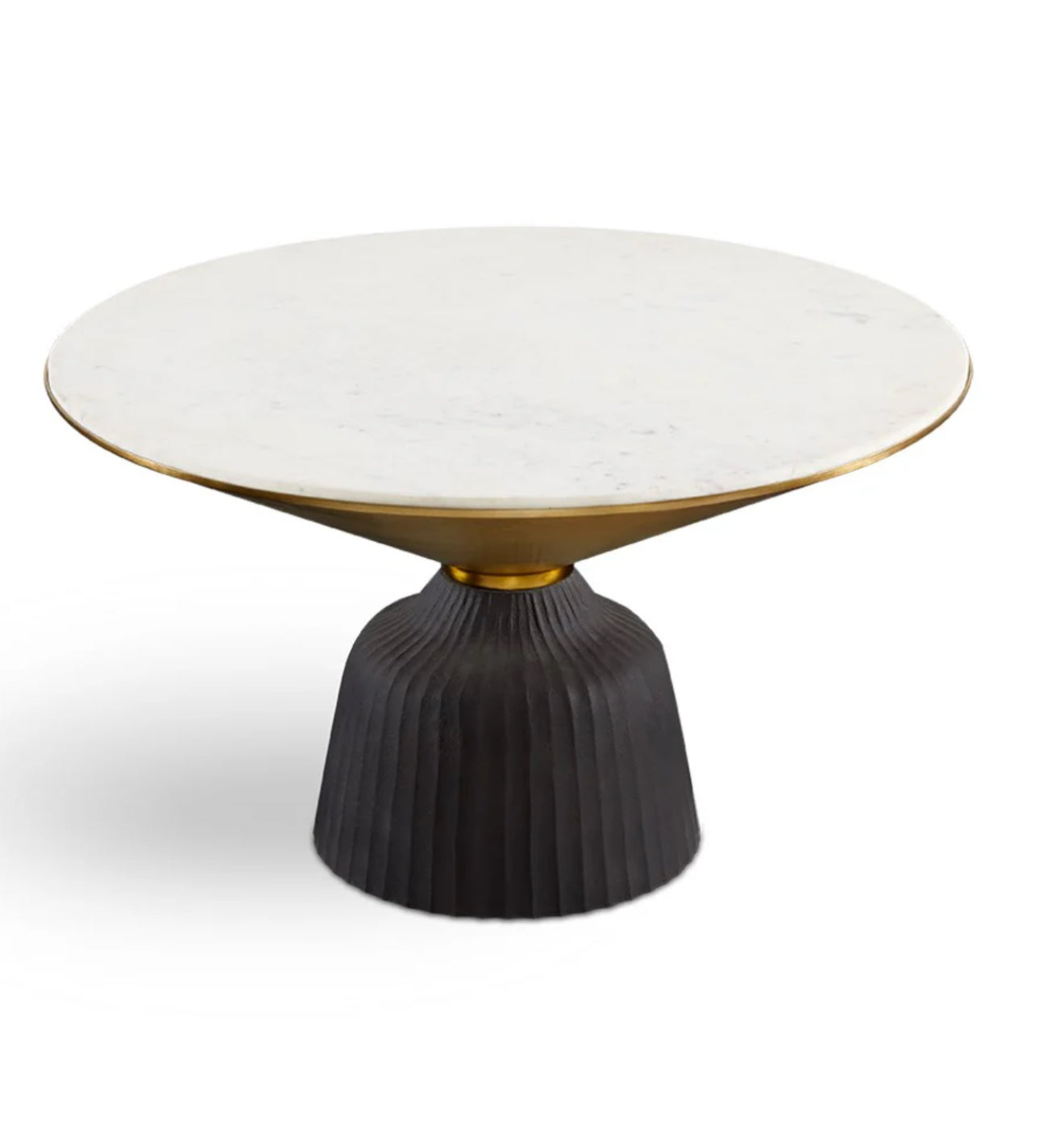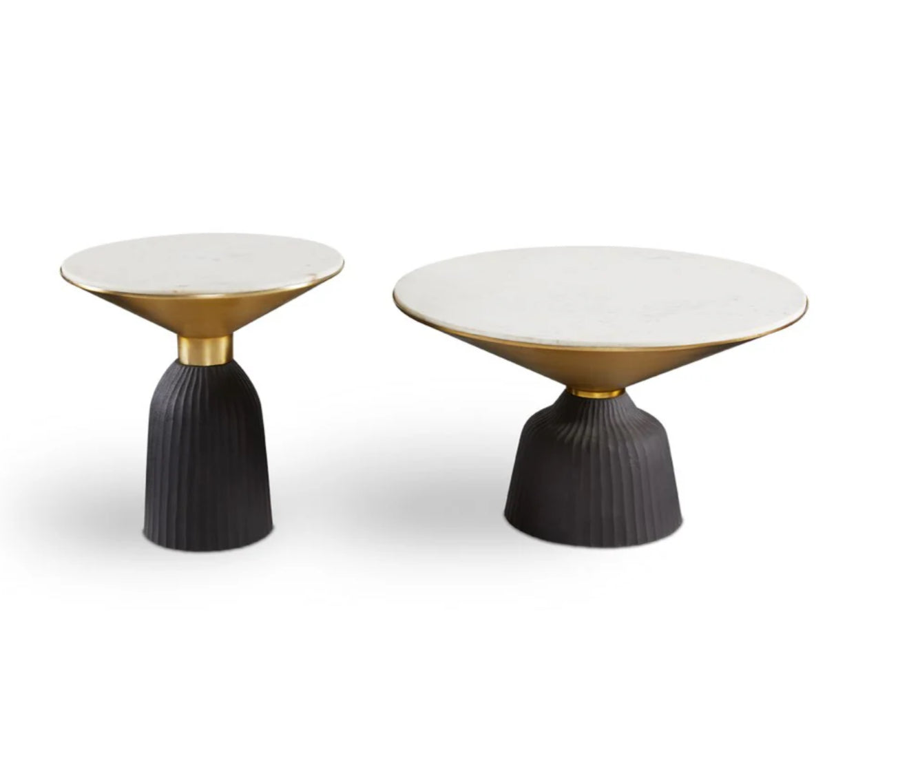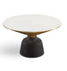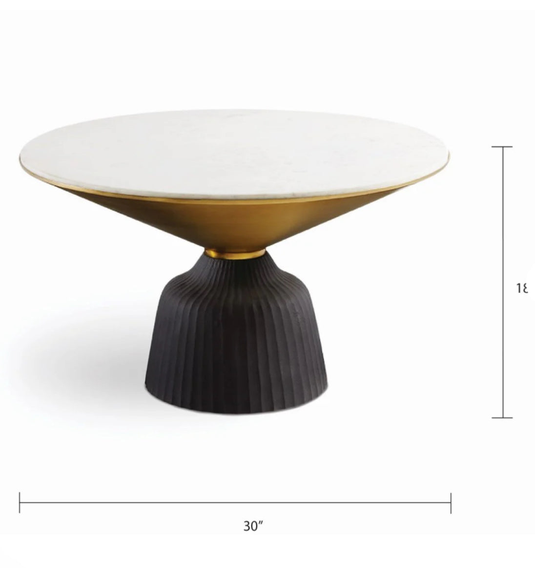 Elite 3-tone midcentury modern design. The Katerina marble coffee table boasts an impressive mixture of textures. Stemming from a ribbed black metal pedestal that blooms into a smooth brushed gold support for the marble top. Choose to admire in a formal living room that is off-limits, or use it to the maximum functionality with the matching side accent table.
