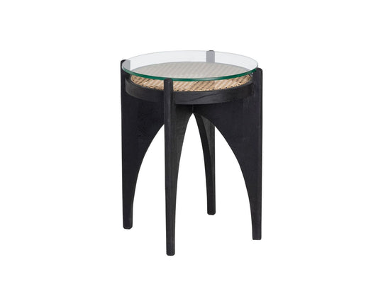 SALE             Adora End Table Inspired by global travels, this round end table combines old world influence with modern style. Features natural rattan top covered with clear glass and a sculpted black mango wood base. An intriguing design from all angles....Sale price $785.00Regular price $1,047.00Sale price $785.00Regular price $1,047.00