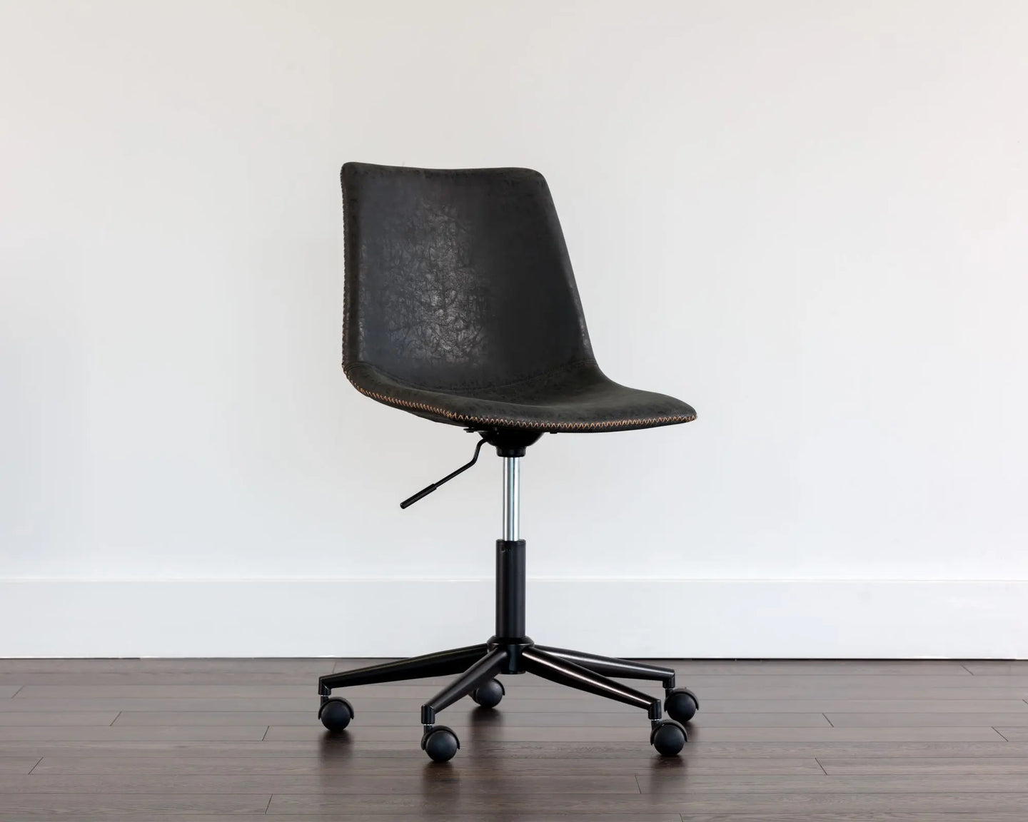 A comfortable and compact office chair. Designed with a simple, mid-century silhouette. Features an adjustable seat and castors for mobility. Stocked in antique black, brown and grey faux leather. Handle With Care: This design has been crafted with faux leather. Faux leather is manufactured to reflect the natural characteristics of leather; as such, colour variations, markings wrinkles, grooves, and light scratches are appreciated characteristics. No two pieces will be alike. Visit our Product Care page for more information on how to ensure the lasting beauty of this piece.