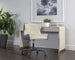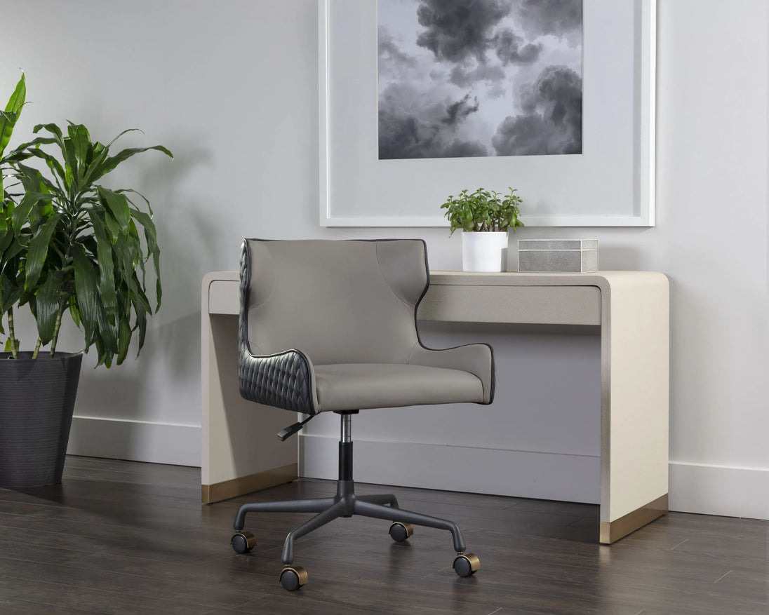 A classic office chair featuring a substantial seat upholstered in contrasting dillon cream and thunder faux leather. Diamond stitching on the seatback adds a hint of elegance while a black powder coated metal base completes the look. Also available in dillon stratus with black faux leather combination. Handle With Care: This design has been crafted with faux leather. Faux leather is manufactured to reflect the natural characteristics of leather; as such, colour variations, markings, wrinkles, grooves, and light scratches are appreciated characteristics. No two pieces will be alike. Visit our Product Care page for more information on how to ensure the lasting beauty of this piece.