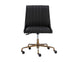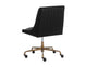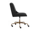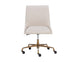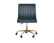 A sleek, urban designed office chair featuring bold vertical stitching on the seat and back in a beige linen fabric. Finished with a rustic bronze aluminum base with added castors for mobility. Also available in vintage black faux leather.