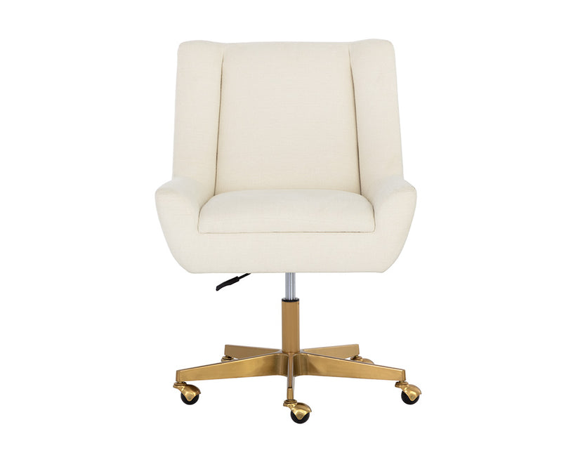 Add a hint of modern glamour to any workspace with this grand office chair. Stocked in zenith alabaster fabric. Completed with a matte gold stainless steel base with added castors for mobility.