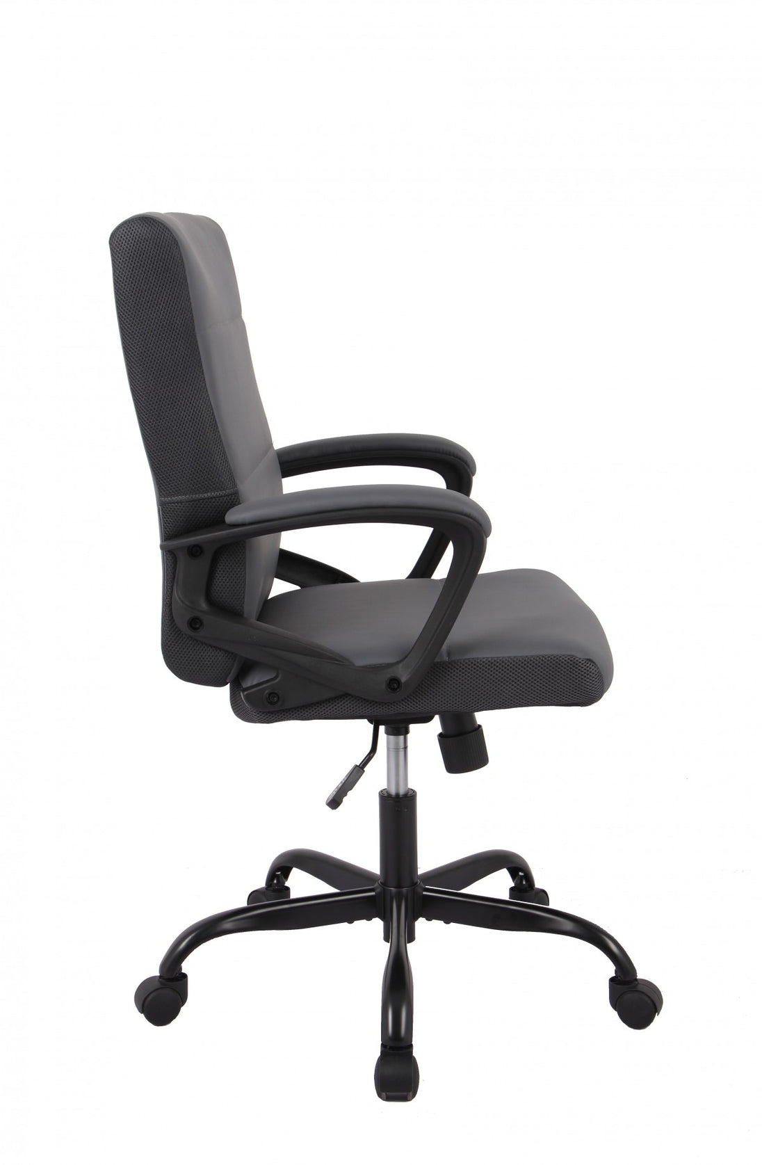 Reflect a sense of authority and comfort with this practical office chair with premium features for a sophisticated look and professional experience. Wrapped in a rich trout gray upholstery with a soft padded seat for optimum comfort. Made to ensure productivity with a perfect posture during office hours, this chair features a slightly arched backrest and a contoured but fixed armrest to support your back and rest your hand. The five dual castors and full 360-degree swivel allow easy mobility in the workplace while the 100mm hydraulic lift facilitates height adjustment and can hold a maximum weight of 264 LBS. In addition to its stylish look, This chair features a 350 mm powder-coated base that speaks for its durability. If you’re looking for something sleek and sophisticated to meet the standard of your workplace, this neutral-hued chair desk is a perfect pick for you to resonate with your style.