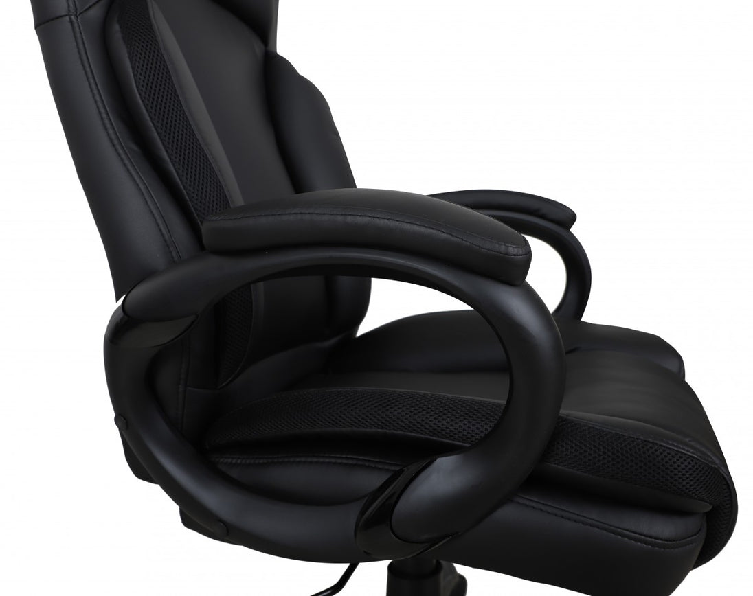 Set yourself up for success with this high-backed, ergonomic office chair. As fashionable as it is functional, this sleek chair features a convenient tilt mechanism and gas lift function to ensure proper alignment while you’re working at your desk. Lean into the full back and headrest and place your arms on the curved armrests to enjoy comfortable support as you work. The sturdy pedestal base features five wide legs for stability, each with a rolling castor for ease of movement. The rich fabric cover is finished in a neutral dark black color that easily complements any home office décor with its clean and contemporary look.