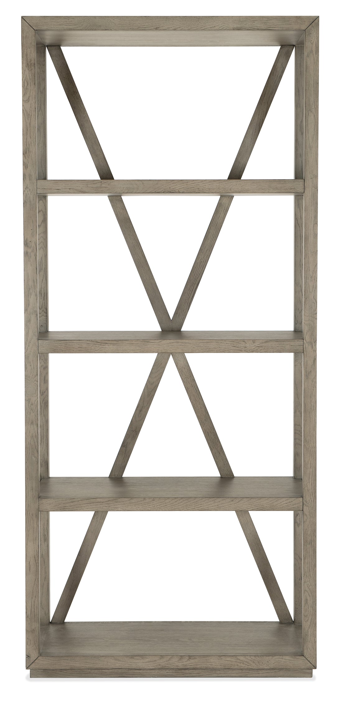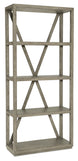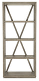 With a rustic, weathered finish, crisp lines and an organic grain pattern, the Wisemans Etagere has a classic X-back and chic silhouette with four fixed shelves. Crafted of Oak Veneers, the etagere is finished in the soft smoked gray Mink. Anti-tip hardware is included.