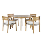 The Arden 5-Piece Outdoor Dining Set includes a round Acacia wood slat top table and four cushioned wicker dining chairs, designed for durability and comfort. The solid Acacia table provides natural weather resistance and features a slatted top that drains water easily, preventing pooling. Each chair combines a sturdy Acacia frame, ergonomic wicker back, and padded cushion for lasting comfort. Stylish and functional, this patio dining set enhances outdoor living with rustic elegance and modern appeal.