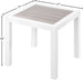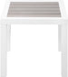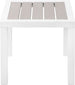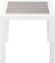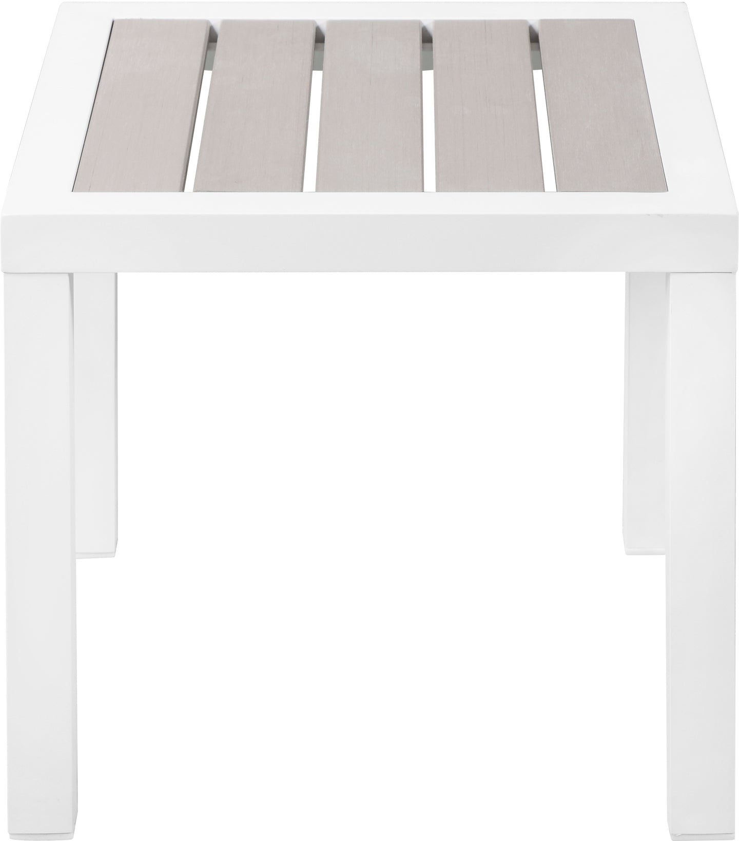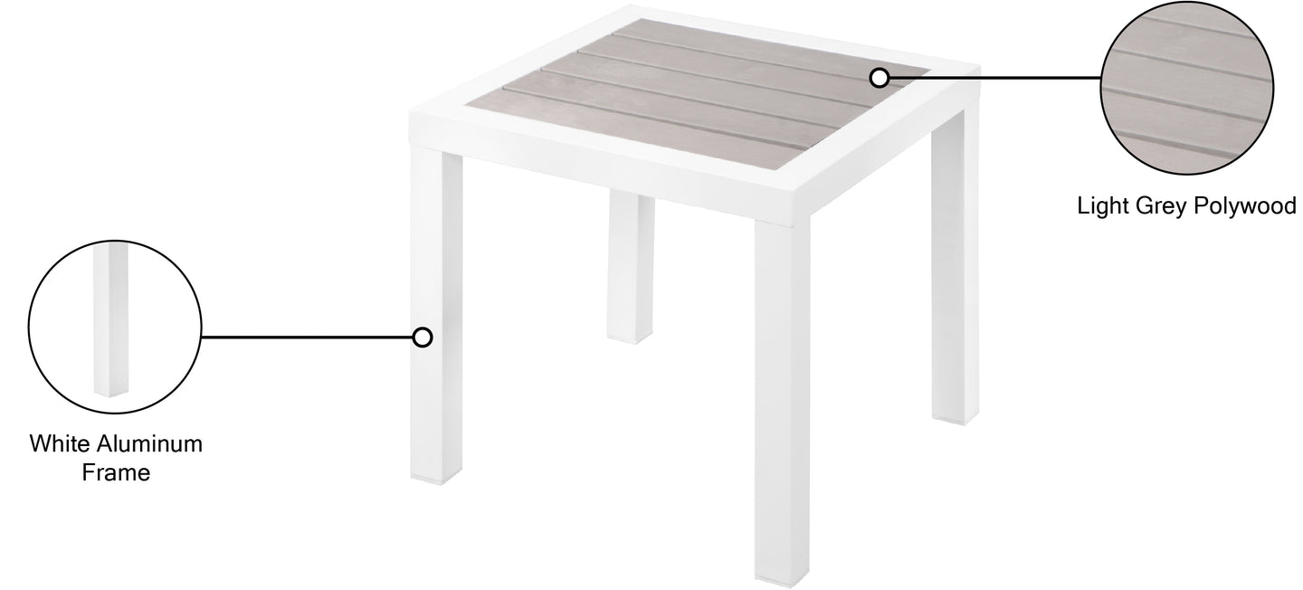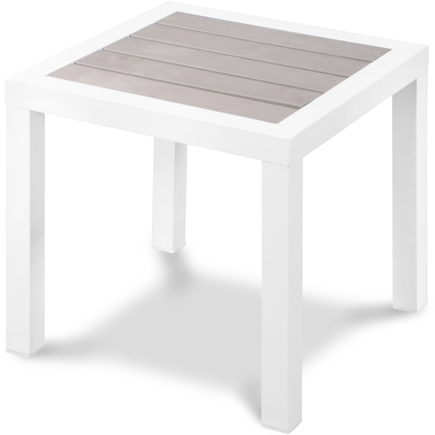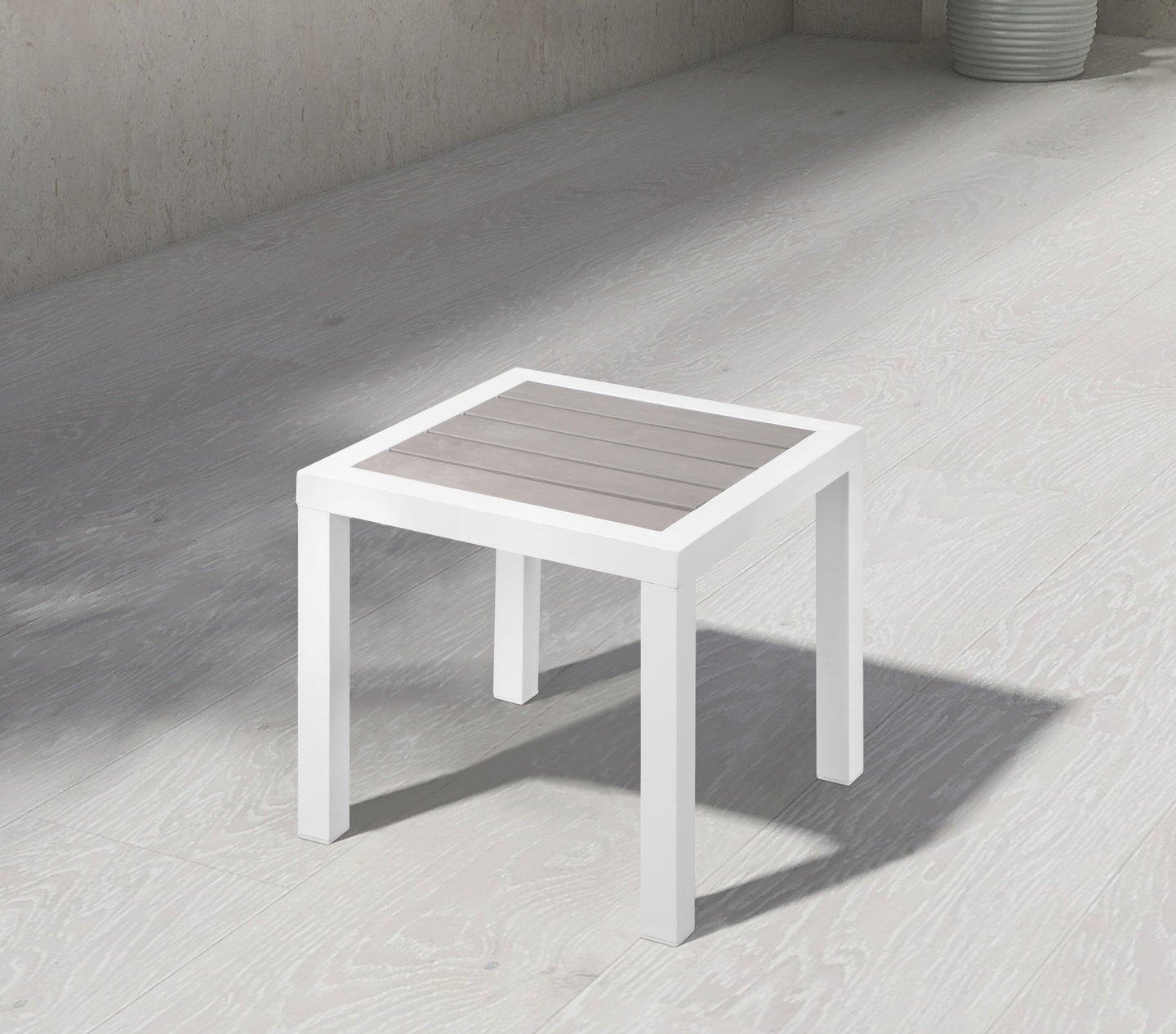 Add the comforts of indoors to your outdoor living space with this Nizuc end table. This sophisticated modern table is an ideal spot for resting a frosty drink on a sunny day. The top of the table is made from light grey Wood Look accent paneling and is slatted, so moisture dissipates easily through its cracks. An aluminum frame adds resilient durability to this table's design, ensuring it lasts and lasts, season after season.