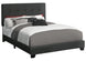 - Upholstered, queen size bed frame in a trendy black boucle fabric with black block feet, bringing fashionable style to a transitional bedroom decor.