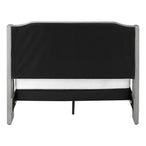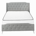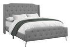 Bring a luxurious feel to your bedroom with the updated classic styling of this queen-size, upholstered bedframe with a wingback headboard. Covered in an elegant grey linen-look fabric over foam cushioning on all sides, this bed is embellished with button tufting on both the gently arched headboard and footboard for an opulent appeal. The support legs are covered with the same grey linen inspired material for a polished finish, and the slanted chrome metal feet at the footboard adds that surprise modern touch. A standard queen size box spring and mattress is required but not included and must be purchased separately. All parts and assembly instructions are included inside the zippered compartment on the back of the headboard.
