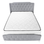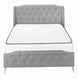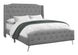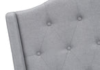 - Queen size platform bedframe upholstered in a chic grey linen-look fabric over foam padding on all sides, with luxurious button tufting on the wingback headboard and curved footboard