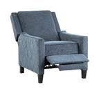 Love the idea of stretching out but prefer the look of an armchair to a traditional recliner? If so, the Banks II seating collection was tailor-made for you. This attractive seat has all the hallmarks of an accent chair with a modern profile atop exposed black-toned wooden legs, square track arms, and diamond quilting on the sides. However, when you press gently but firmly back, the self-reclining push-back mechanism is activated, allowing you to lean back and kick up your feet - no button, lever, or remote required! Covered in beautiful textured blue fabric upholstery, the Banks II is a versatile and neutral option that can shine on its own or pair with your existing décor.