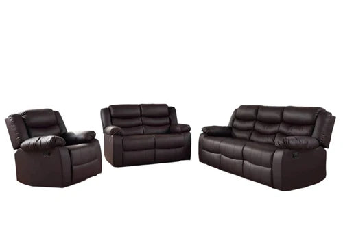 Transform your living room with the Rinaldo 3pc Manual Recliner Set. The sleek brown or Black vegan leather upholstery will add a touch of elegance to any space. The set includes a sofa, loveseat, and chair, all equipped with a manual reclining mechanism for optimal comfort. The sofa also features a convenient drop tray with cupholders for added convenience. Upgrade your home with this luxurious and functional set today!