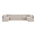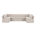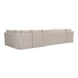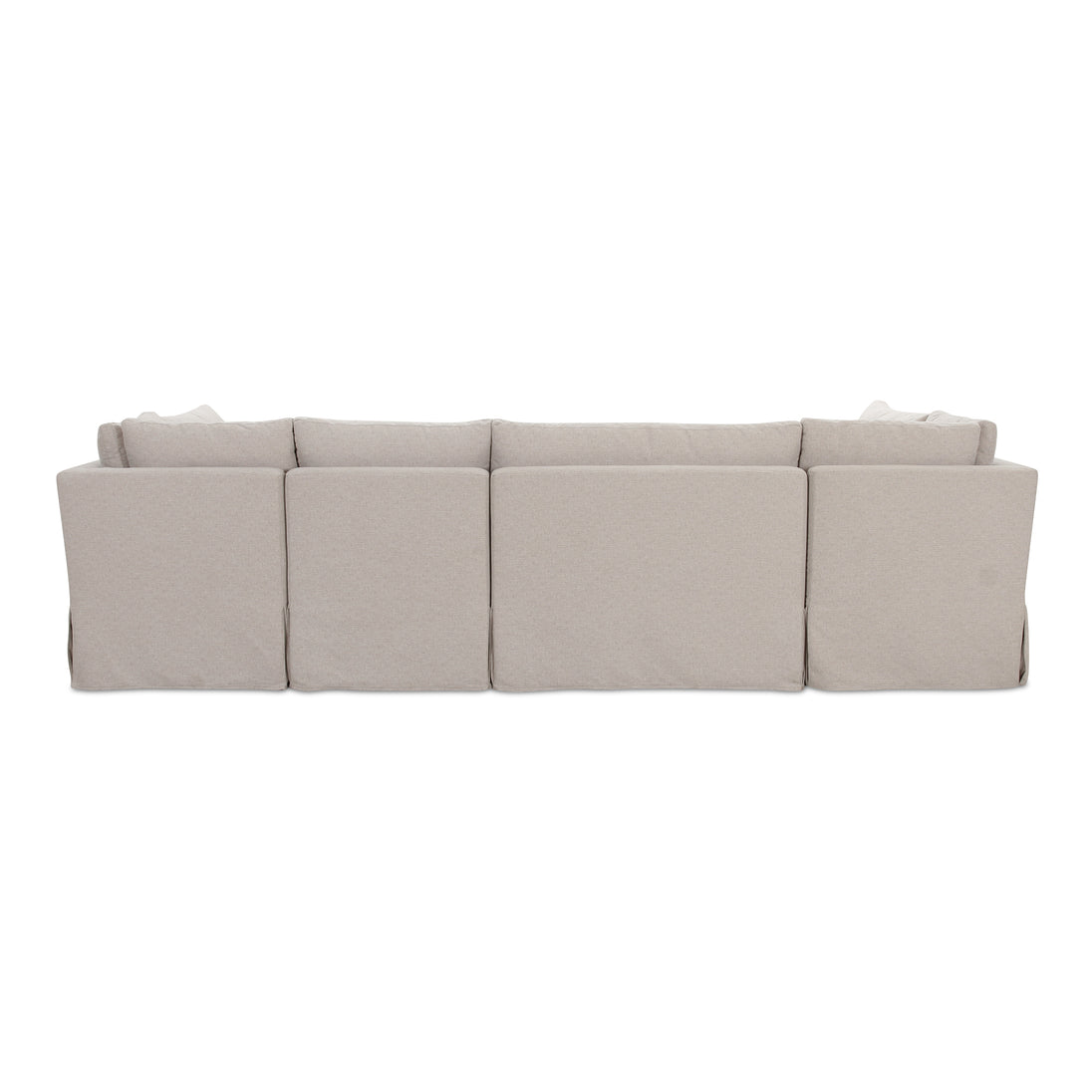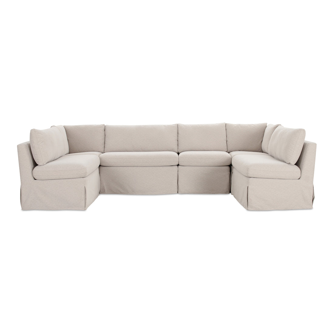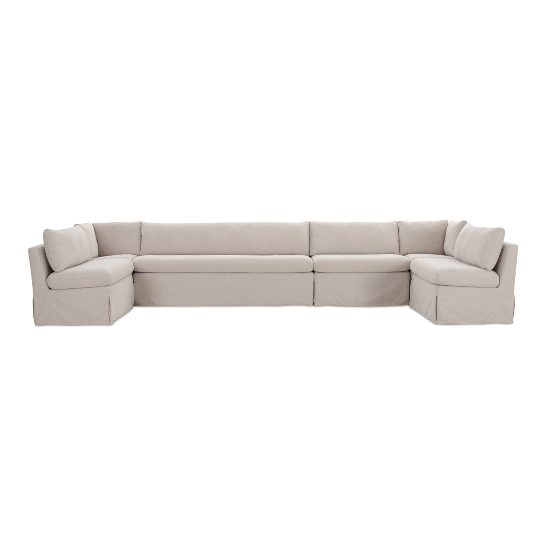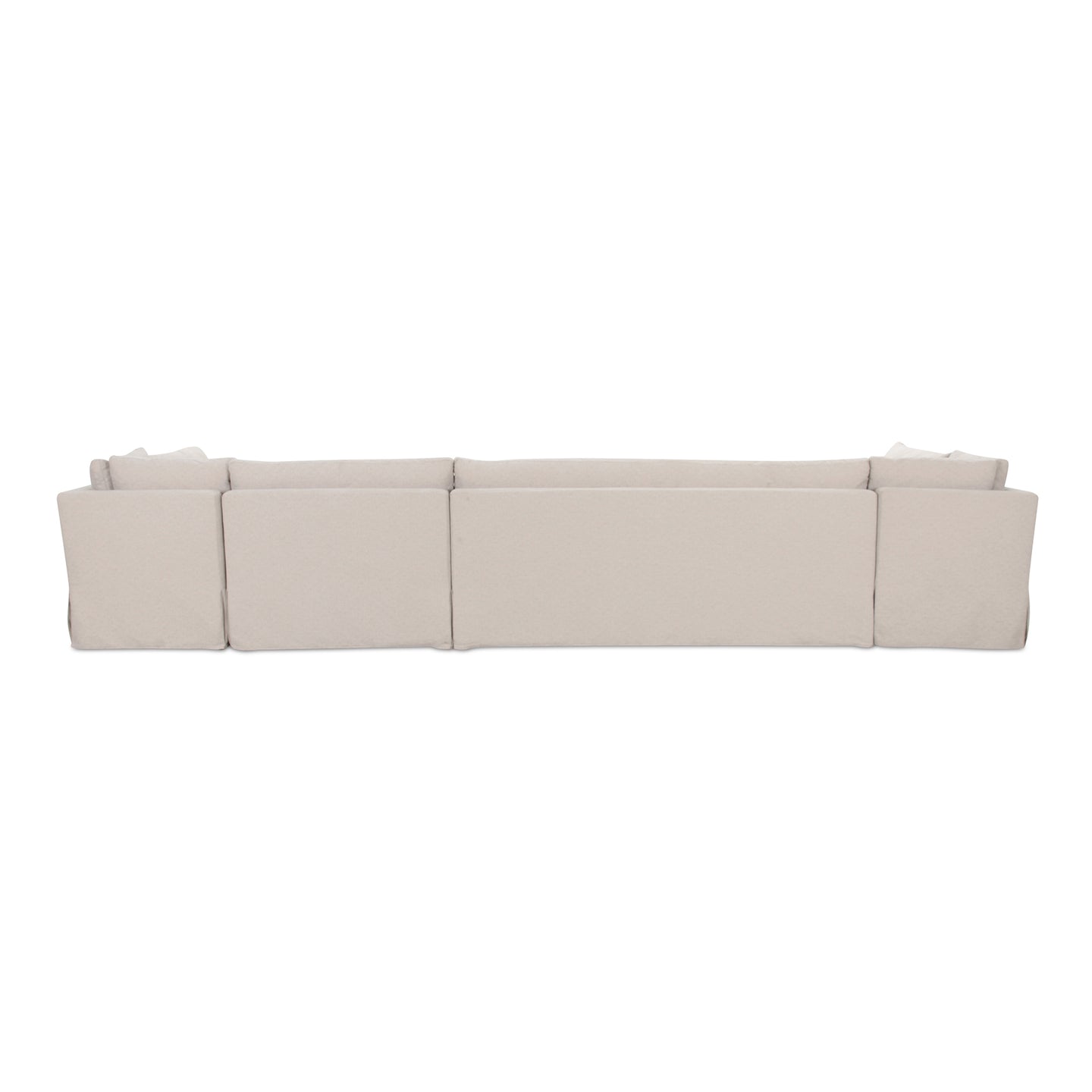 The Fable slipcover dining banquette U-shape's snug-fitting, washable slipcover with inverted pleats offers a tidy appearance and effortless upkeep. A slight tilt encourages a relaxed seating posture with a pillow back and seat cushions for comfort. Designed to be modular, it includes alligator clips to connect with other pieces in the collection, adapting seamlessly to various dining table sizes.