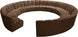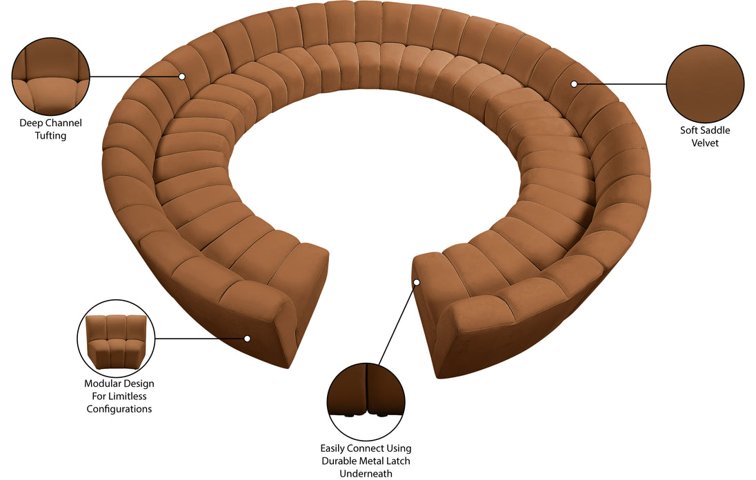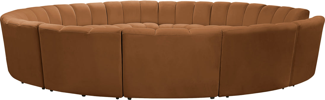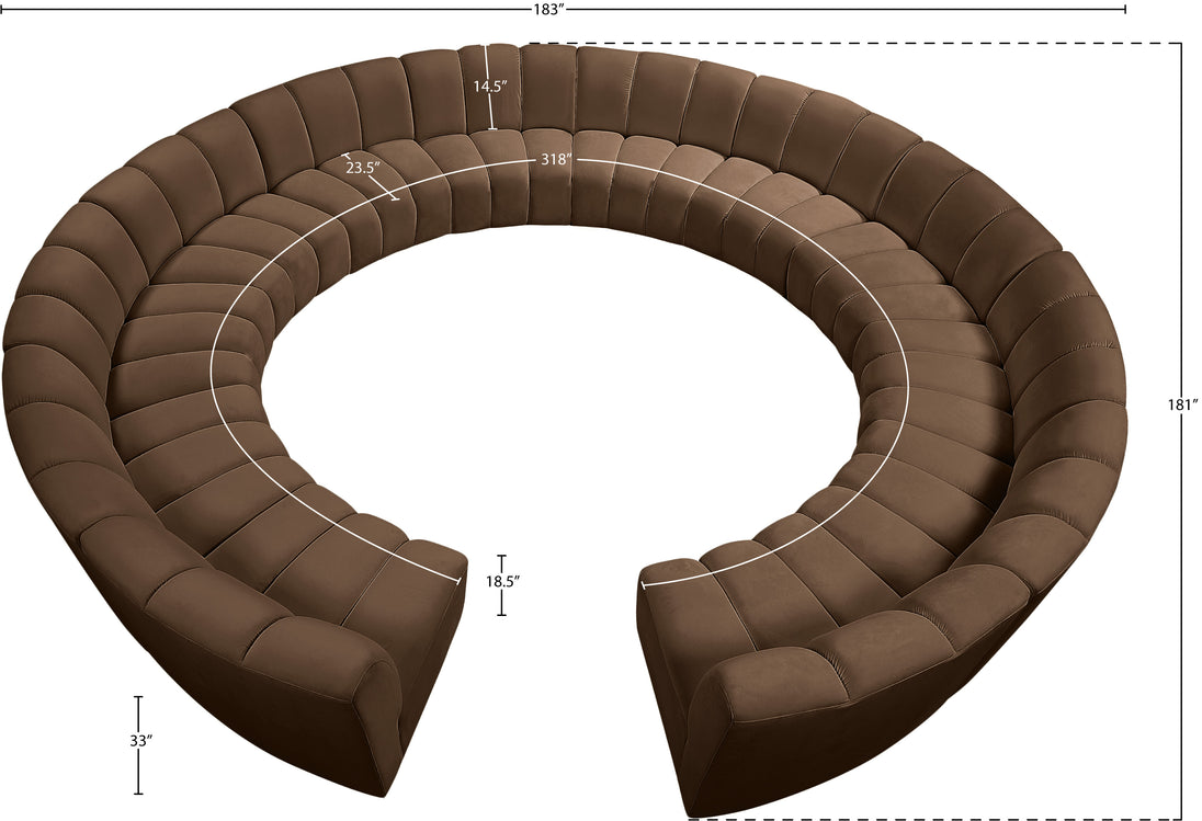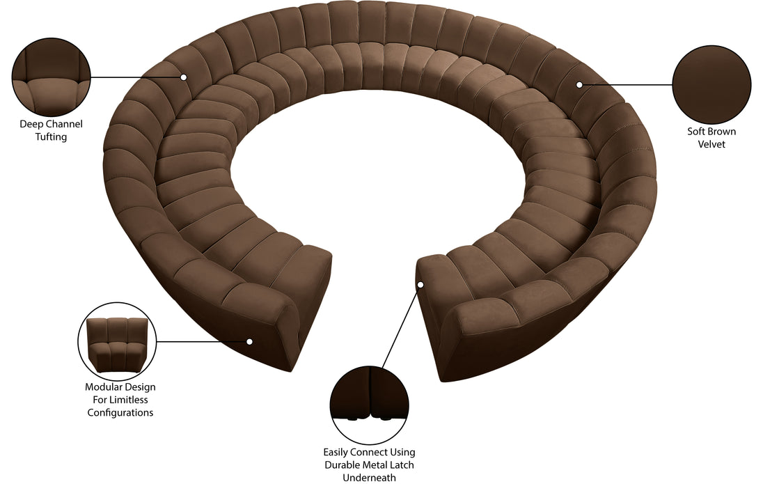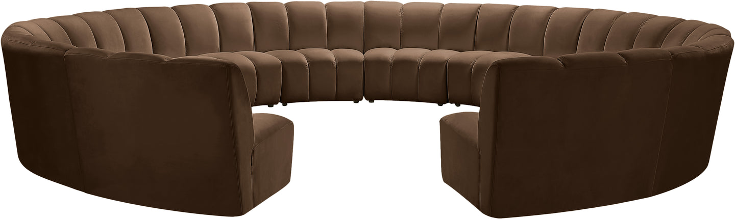 Create a seating group that works for every possible situation with this Infinity 12-piece sectional and other pieces in the Infinity collection. Upholstered in soft Brown velvet material that feels great against the skin and offers long-wearing beauty, this piece fits with other Infinity items for an infinite number of combinations that get your seating requirements just right but that look just as nice when used on their own.