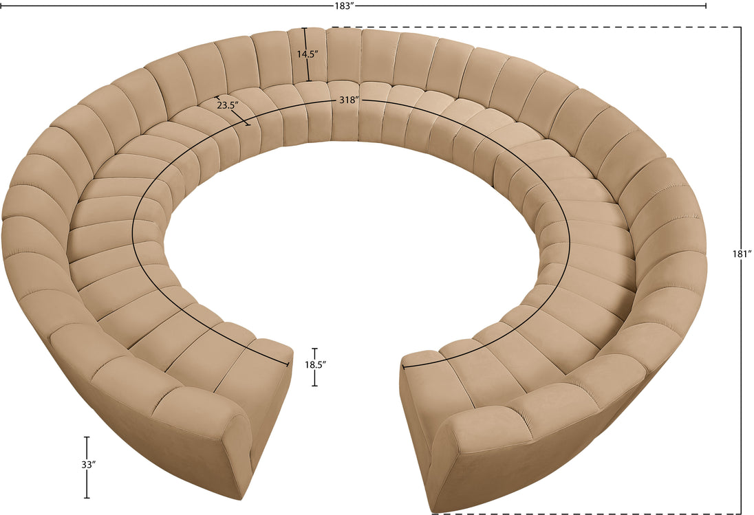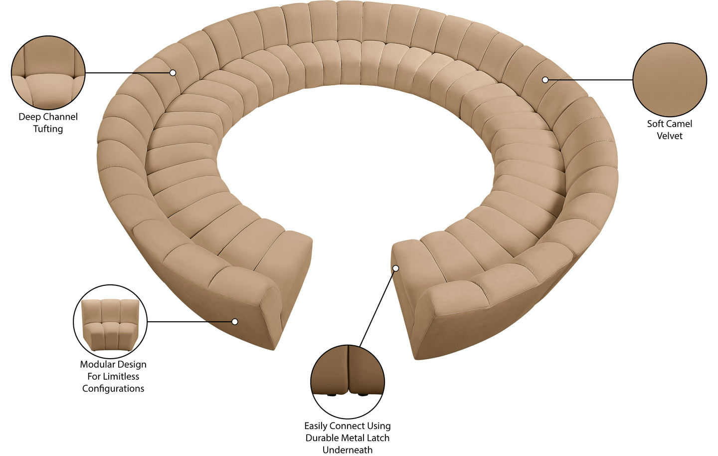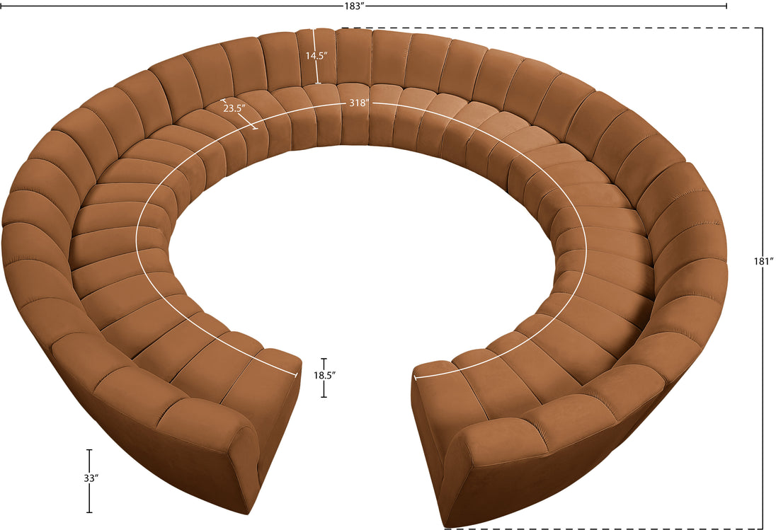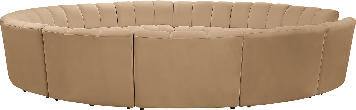 Create a seating group that works for every possible situation with this Infinity 12-piece sectional and other pieces in the Infinity collection. Upholstered in soft Brown velvet material that feels great against the skin and offers long-wearing beauty, this piece fits with other Infinity items for an infinite number of combinations that get your seating requirements just right but that look just as nice when used on their own.