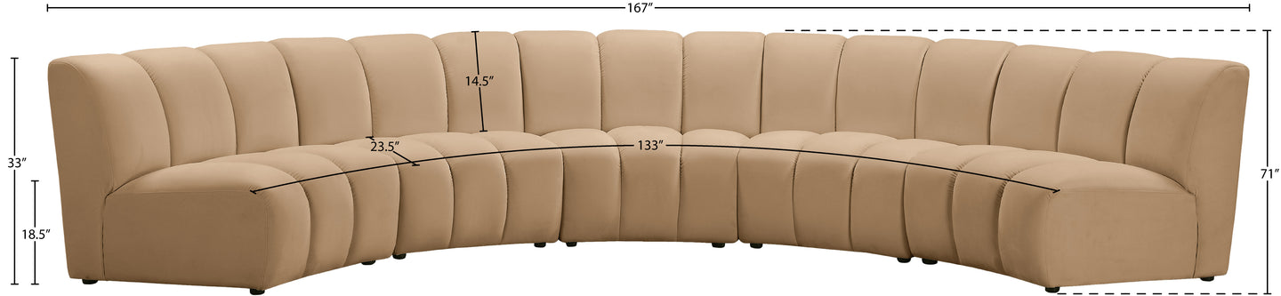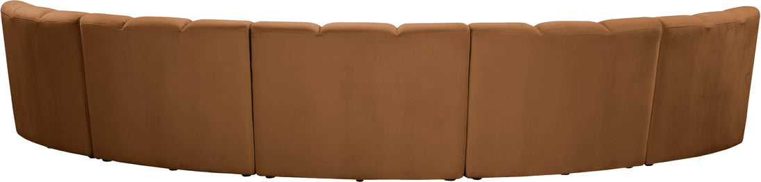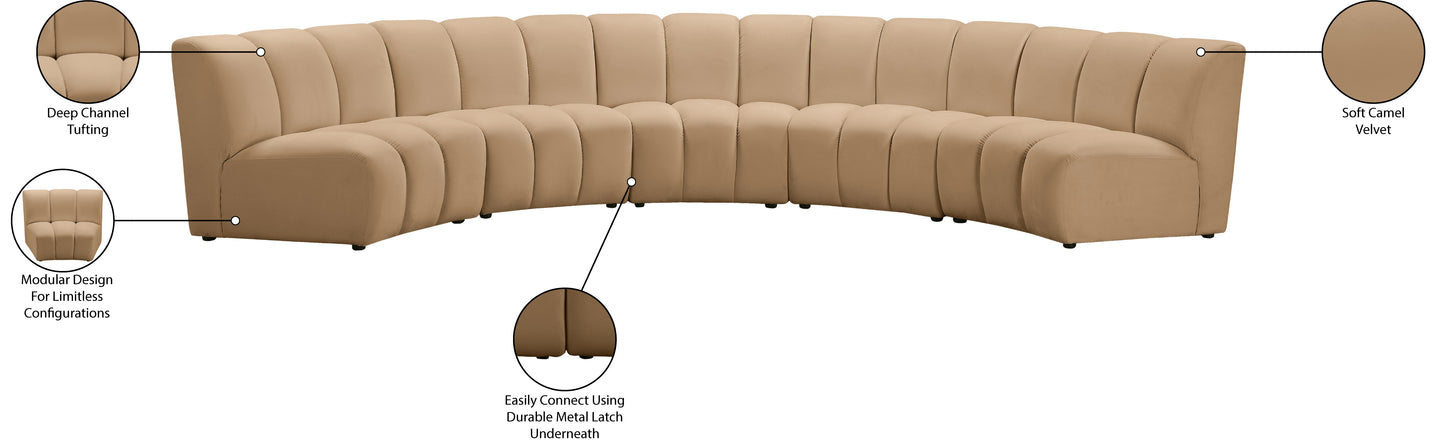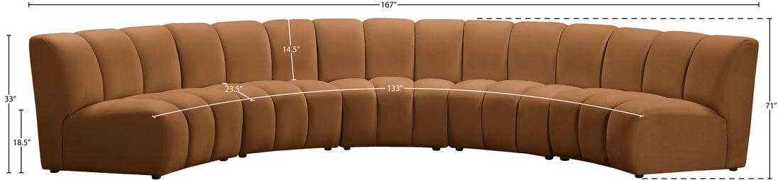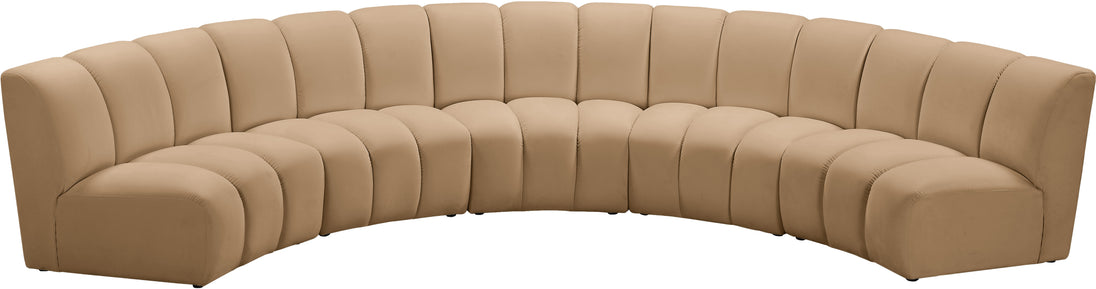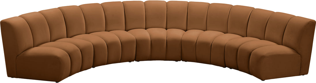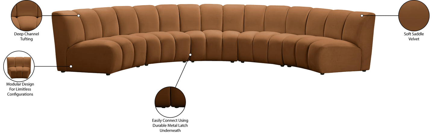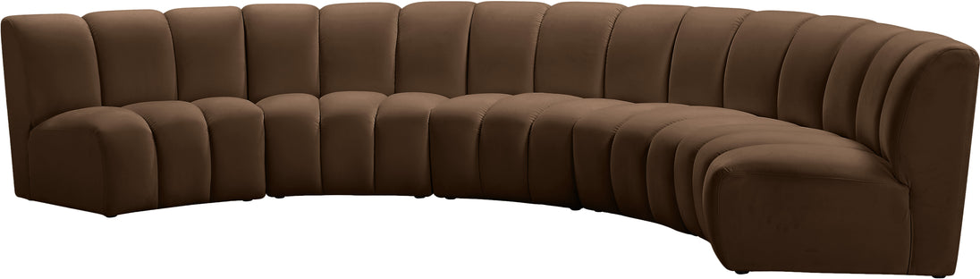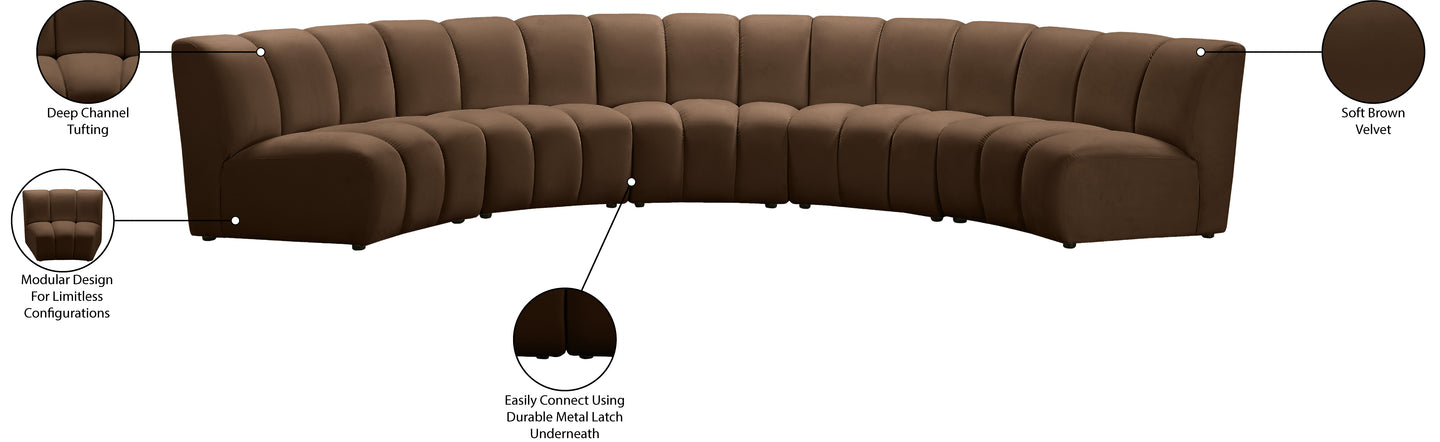 Create a seating group that works for every possible situation with this Infinity modular 5-piece sectional and other pieces in the Infinity collection. Upholstered in soft Brown velvet material that feels great against the skin and offers long-wearing beauty, this piece fits with other Infinity items for an infinite number of combinations that get your seating requirements just right but that look just as nice when used on their own.