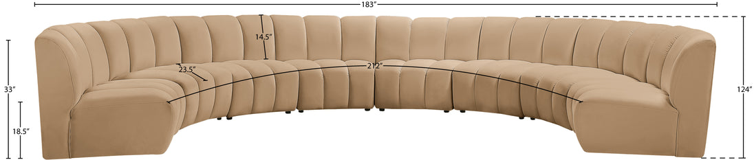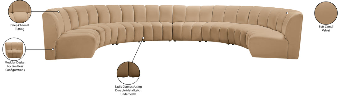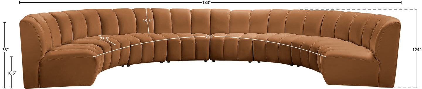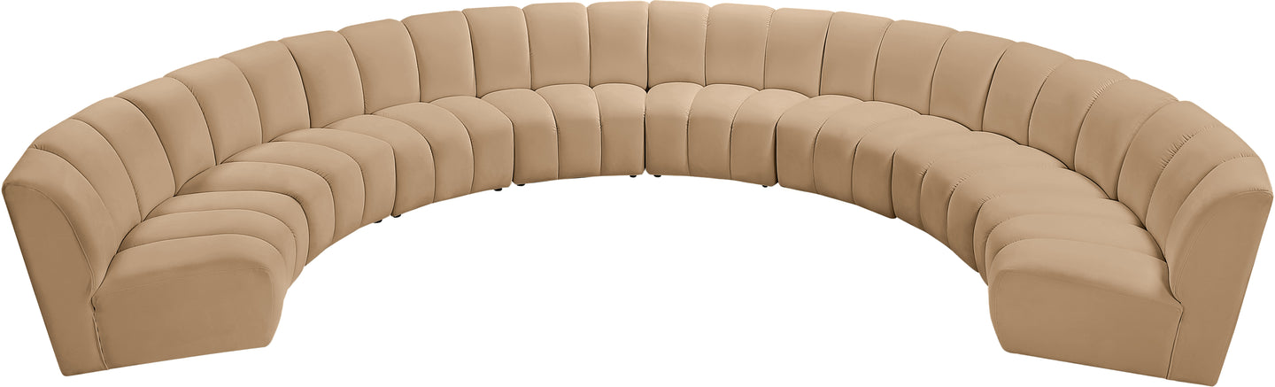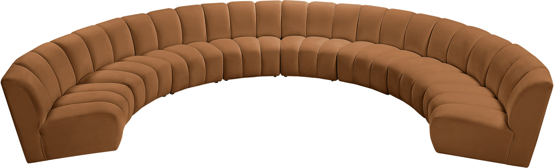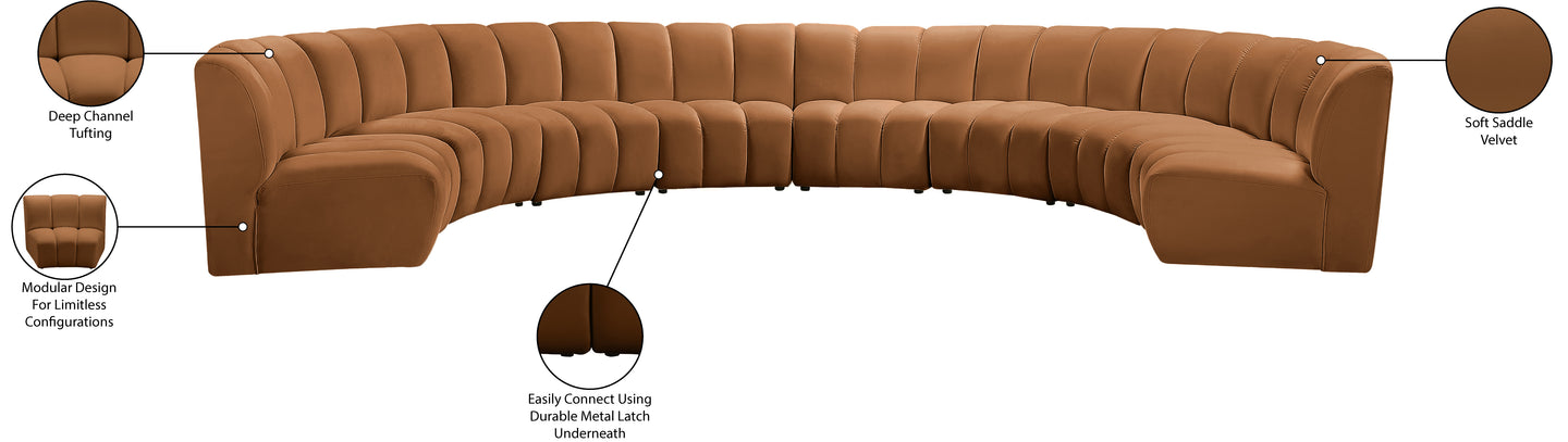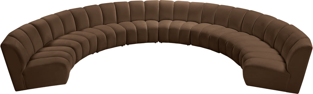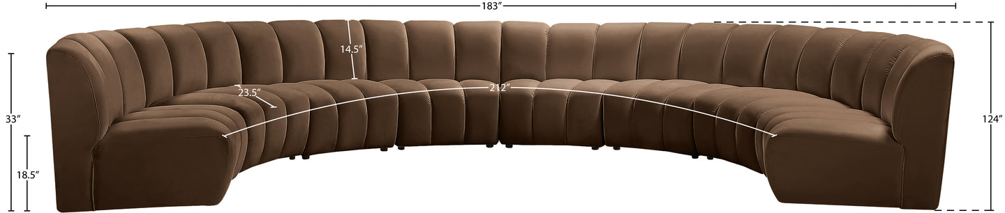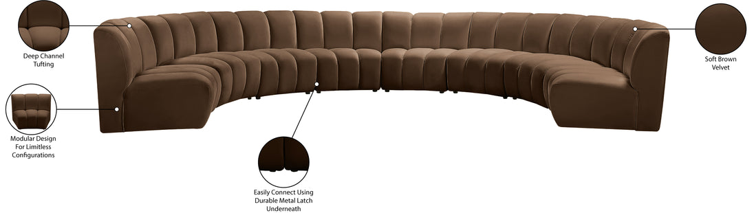 Create a seating group that works for every possible situation with this Infinity modular 8-piece sectional and other pieces in the Infinity collection. Upholstered in soft Brown velvet material that feels great against the skin and offers long-wearing beauty, this piece fits with other Infinity items for an infinite number of combinations that get your seating requirements just right but that look just as nice when used on their own.