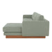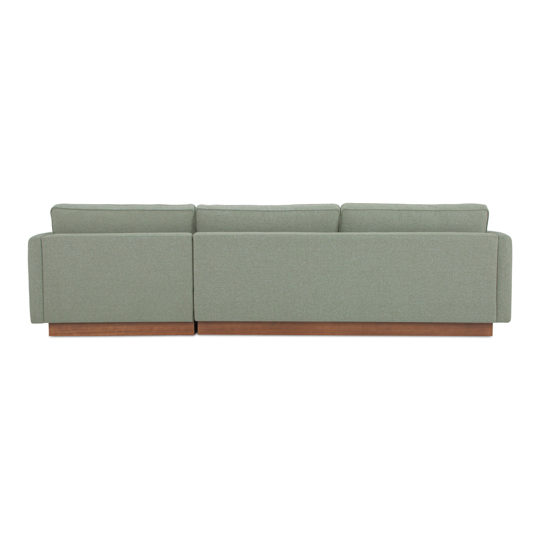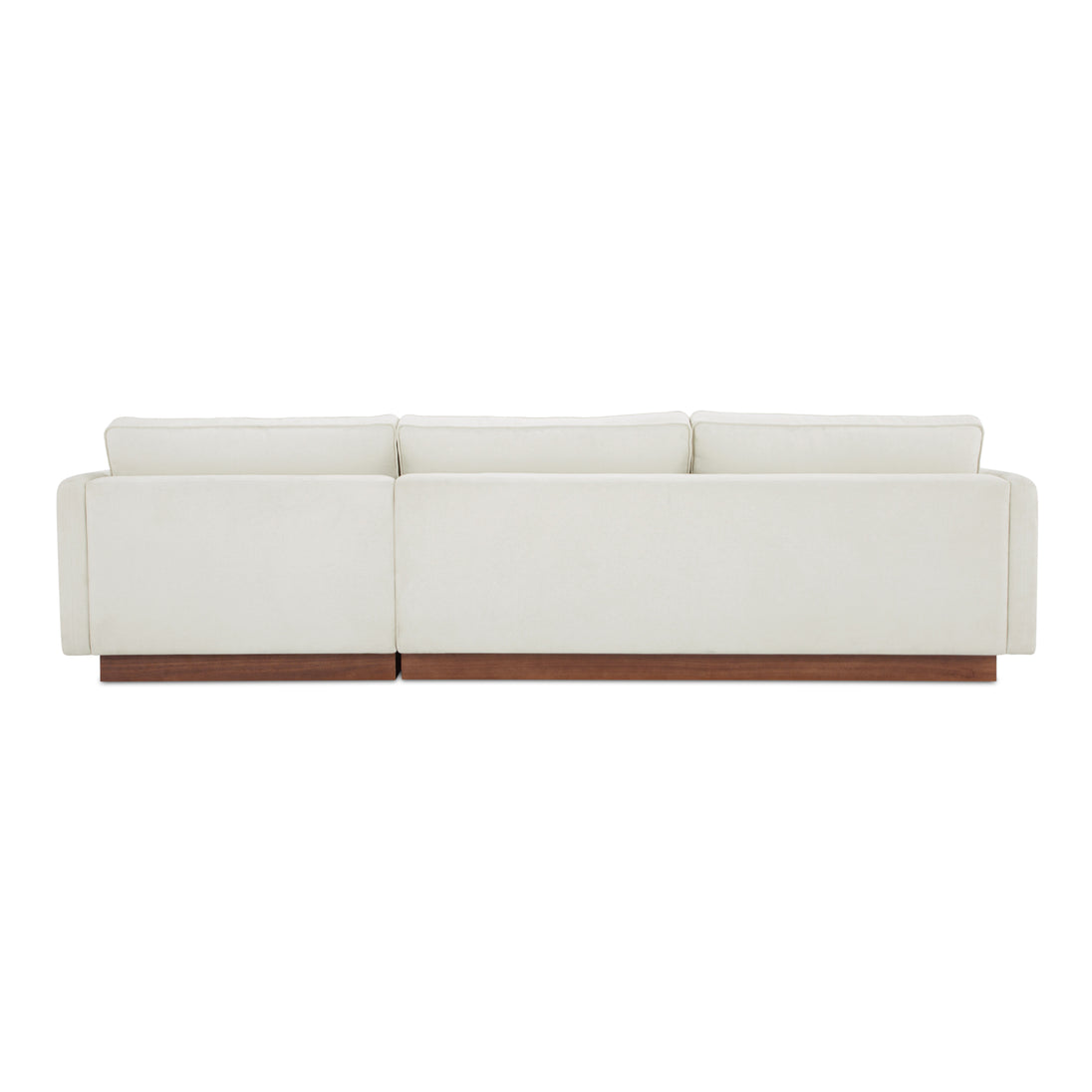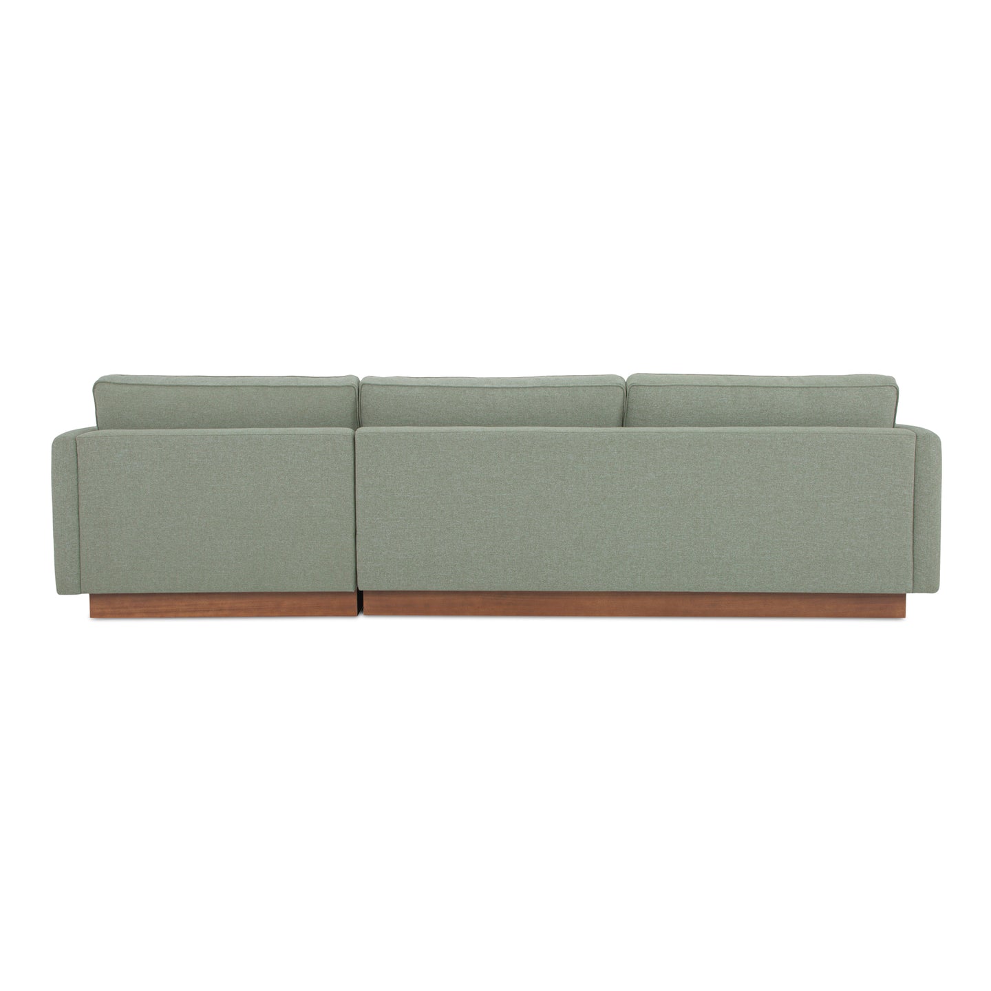 The Vernon sectional blends mid-century design with modern functionality. It features a wooden plinth base for an elevated, lighter appearance. This sectional offers unmatched comfort with removable cushions. Upholstered in durable, OEKO-TEX and Green Guard-certified fabric, it is ideal for family living, combining everyday practicality with durability.