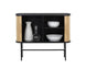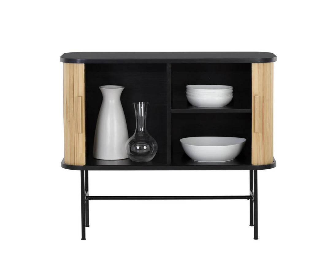 Chic and compact with a minimalist design, this versatile sideboard is made with sustainability in mind. Crafted from FSC-certified pine wood in natural coloring. Features tambour sliding doors with adjustable shelving for ample storage space. Whether used as a buffet, bar, or media center, this piece is perfect for displaying some of your favorite items. This sturdy piece is elevated on a black iron base for a smart and modern silhouette to complement your home. Full Assembly is required.