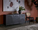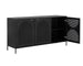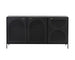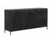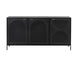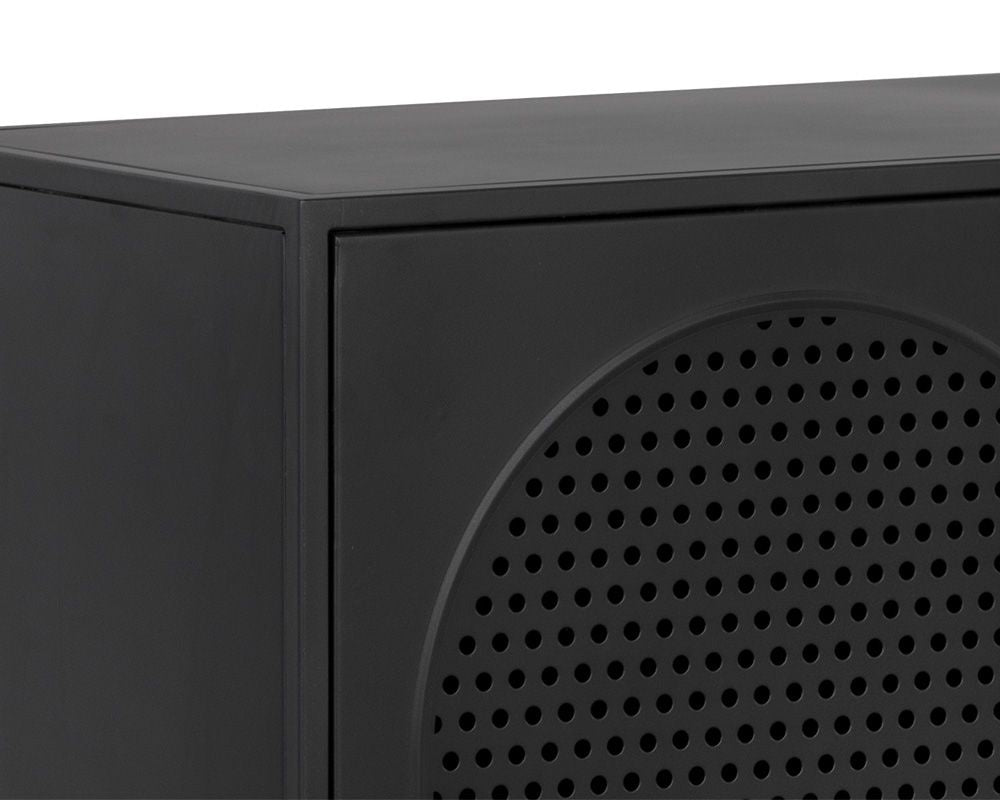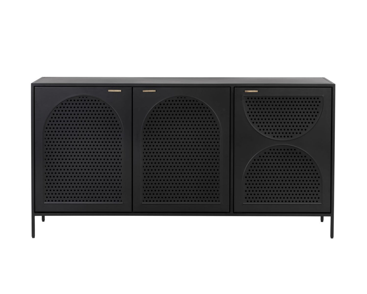 A timeless sideboard with a steamlined composition. Crafted with a black metal frame and completed with brass handles. Features open shelving and three cabinets with an arched perforated metal design. Pairs well with the Aziza media console and cabinet and nightstand. Made in India. With refined craftsmanship, this design was brought to life by skilled local artisans. By nature, these materials develop unique imperfections such as markings and colour variations for a truly one-of-a-kind piece.