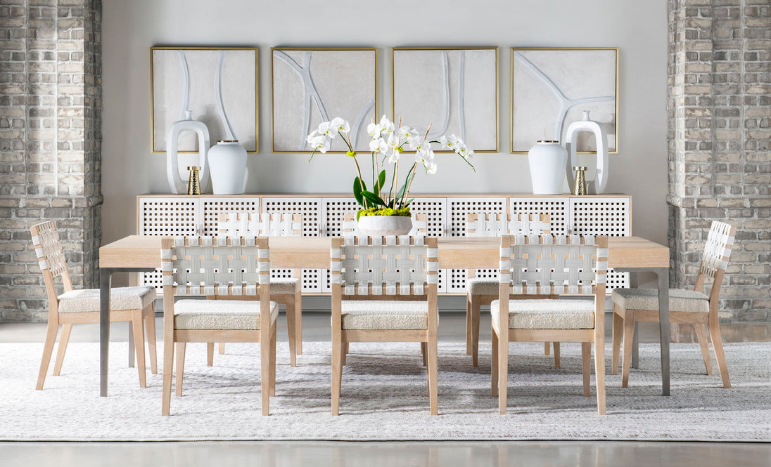 Capture a modern resort feeling with the Biscayne Collection by Legacy Classic - Modern. A light and airy blonde Malabar finish is paired with faux woven raffia, alabaster doors, and boucle fabrics for a serene and stylish setting.