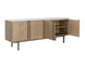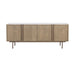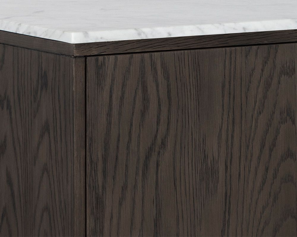 Sleek and handsome, this sideboard fuses the best of mid-century and modern design. Made with a solid oak wood frame and features a beautiful white marble top. Completed with a metal base and hardware in an antique brass finish. Anti-tip kit included. As marble is a natural material, unique veining, pitting, fissures, micro-cracks and colour variations are all characteristics that add to the uniqueness and beauty of each piece.