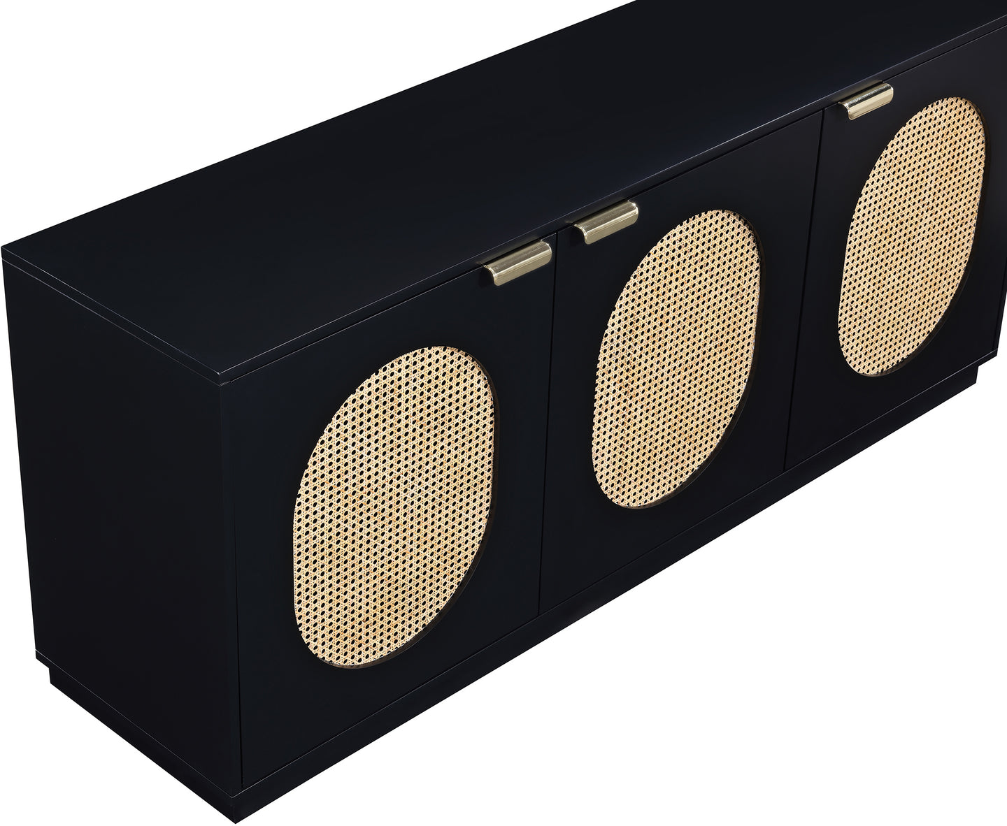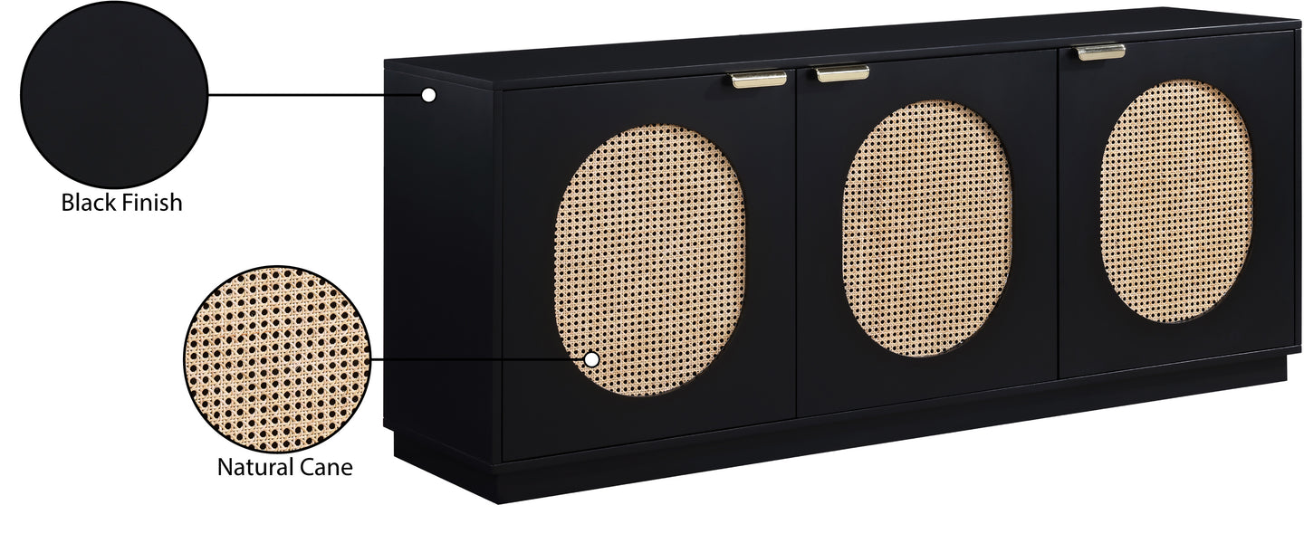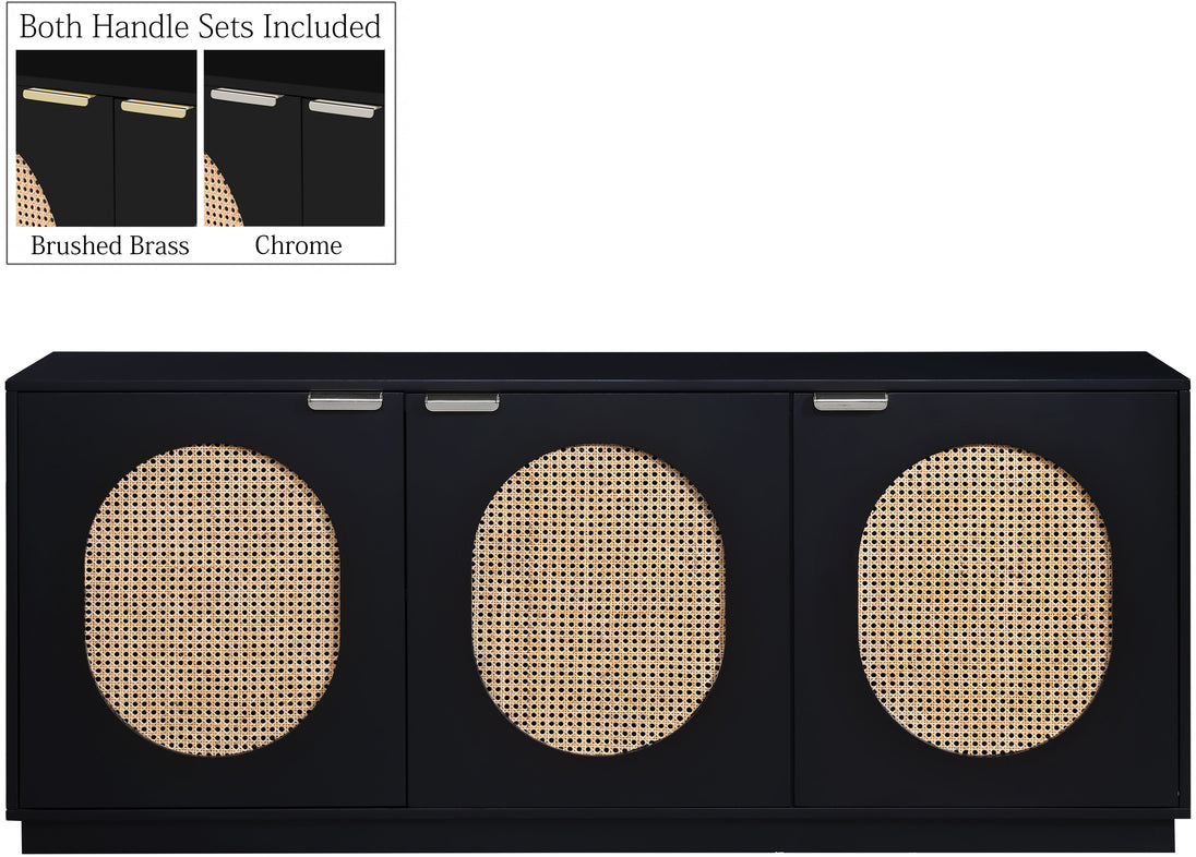 Provide extra storage space in your home with this elegant Cane sideboard/buffet from Meridian Furniture. Crafted from wood, steel, and natural cane, this buffet is sturdy enough to last for years. Its black and brushed brass finish gives it a bold appearance that is sure to catch the eyes of all who enter your home. It includes a complete set of brushed brass and chrome handles so you can decide which match your decor.