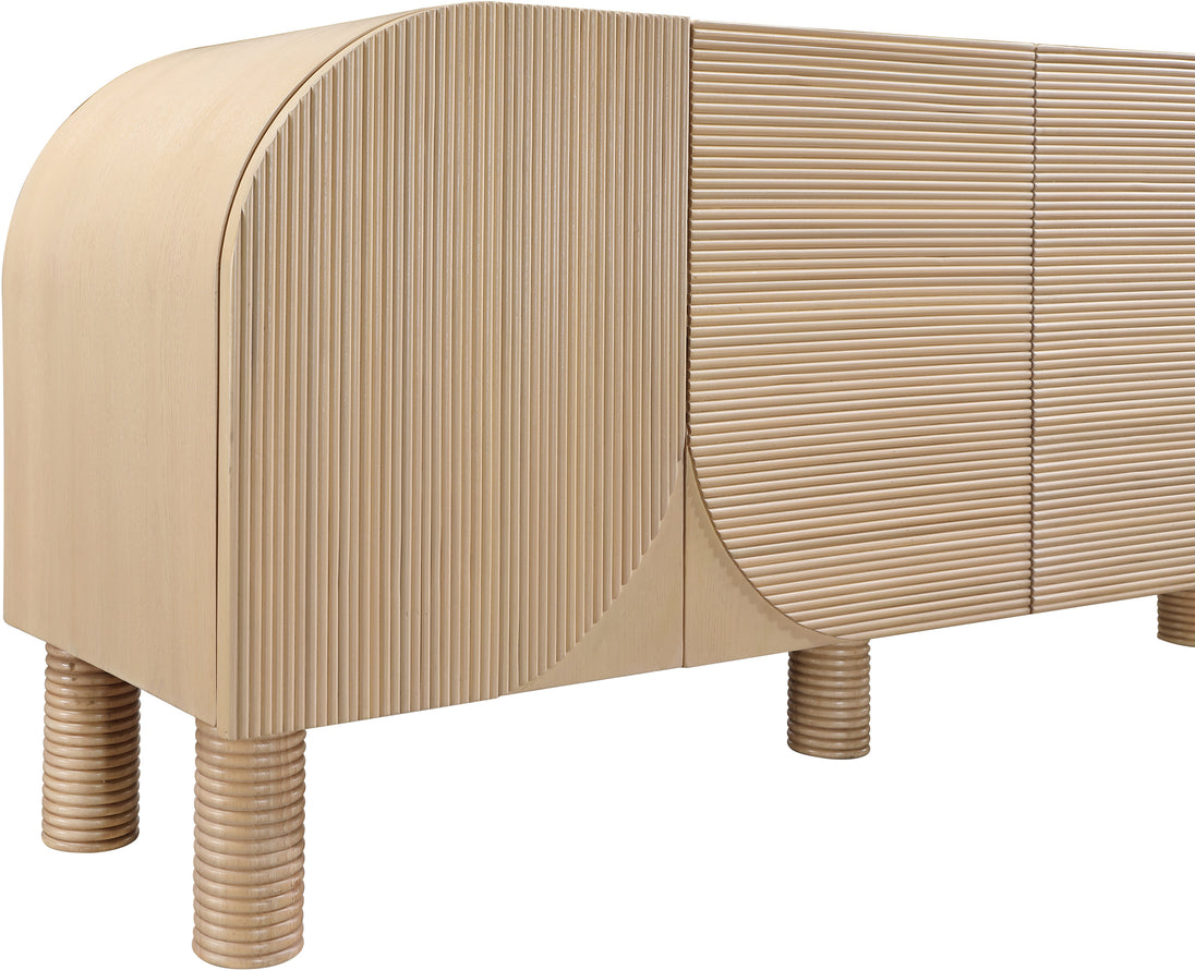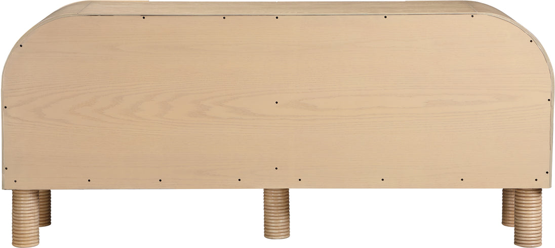 Enhance your dining room with the Casablanca Oak Sideboard Buffet. Crafted with a rich natural finish and oak wood veneer construction, it exudes timeless elegance with its art deco design. Concealed behind its doors lies ample storage for your formal dinnerware, flatware, and linens, keeping them organized and easily accessible. Designed for versatility and easy storage, this piece gives you a stylish surface for displaying dishes or serving food during special occasions. Add valuable functionality and beauty to your dining area with this sleek and handsome sideboard buffet.
