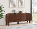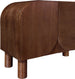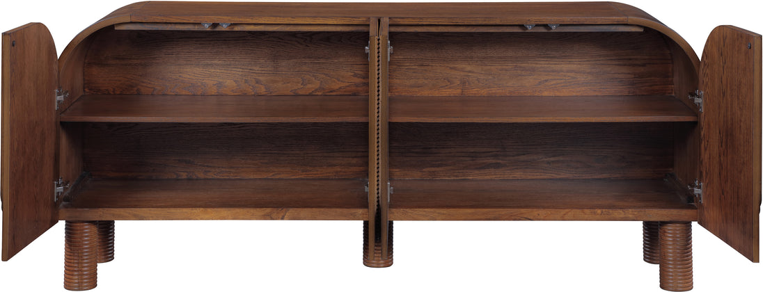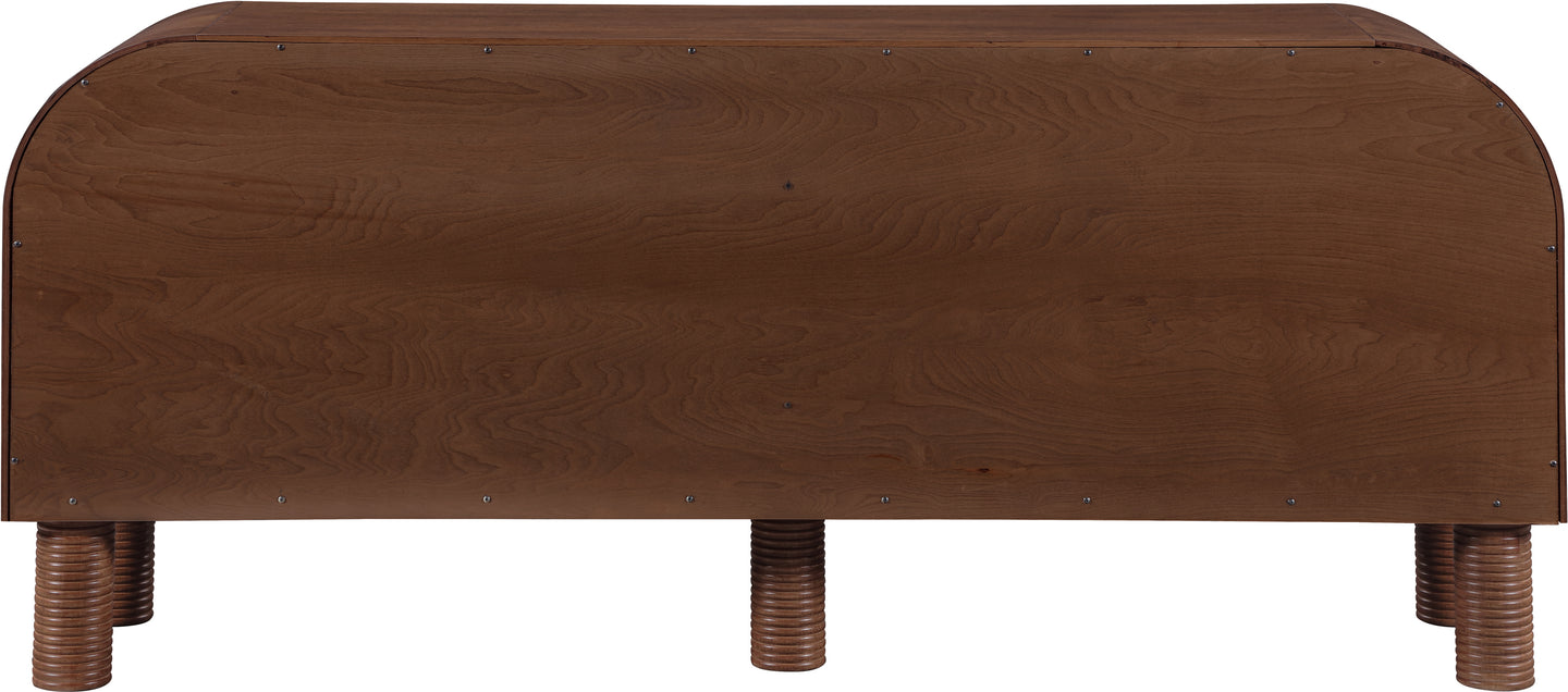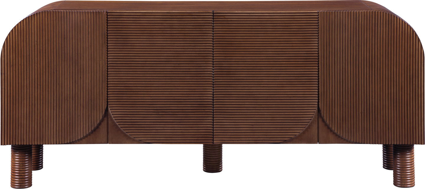 Enhance your dining room with the Casablanca Walnut Sideboard Buffet. Crafted with a rich walnut brown finish and walnut wood veneer construction, it exudes timeless elegance with its art deco design. Concealed behind its doors lies ample storage for your formal dinnerware, flatware, and linens, keeping them organized and easily accessible. Designed for versatility and easy storage, this piece gives you a stylish surface for displaying dishes or serving food during special occasions. Add valuable functionality and beauty to your dining area with this sleek and handsome sideboard buffet.