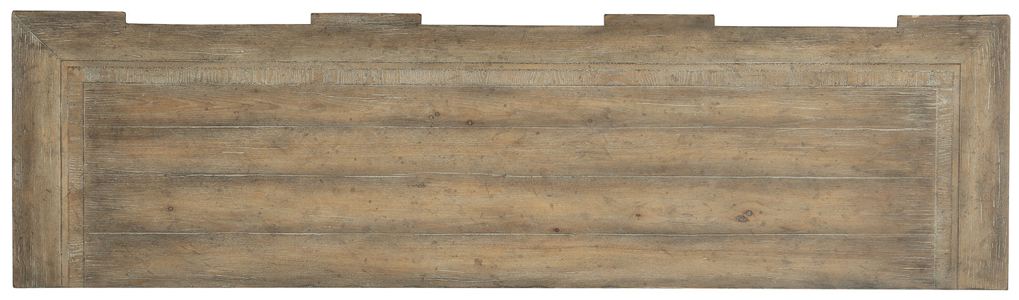 The soaring design of the Castella Credenza will lift your spirits and elevate the atmosphere. Romantic scroll motifs around the apron, column motifs on the case front and an acanthus leaf carving around the base give a classical pedigree to the piece. The Antique Slate finish is luminous with the look of natural wood bathed in sunshine, making the credenza fresh for today's relaxed interiors. The multi-functional credenza has three drawers and a drop-front center drawer and three doors with one adjustable wood shelf behind each.