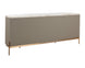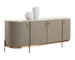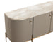 The Cataldi Sideboard defines modern elegance. Luxuriously crafted with a cappuccino marble top, taupe faux leather-wrapped doors and a brushed gold stainless steel base, this piece exudes refined style through its stunning mix of textures and finishes.