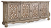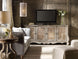 Elevate your entertainment by creating an atmosphere of livable luxury with the Chatelet TV-ready Credenza. The timeless Chatelet Credenza features 4 mirrored fretwork doors, a scalloped base and the soft amber Caramel Froth finish. The accent finish is Paris Vintage, a distressed white with fretwork overlay. Behind the side doors are 2 adjustable shelves and behind the center doors is one adjustable shelf. Wire management.