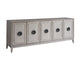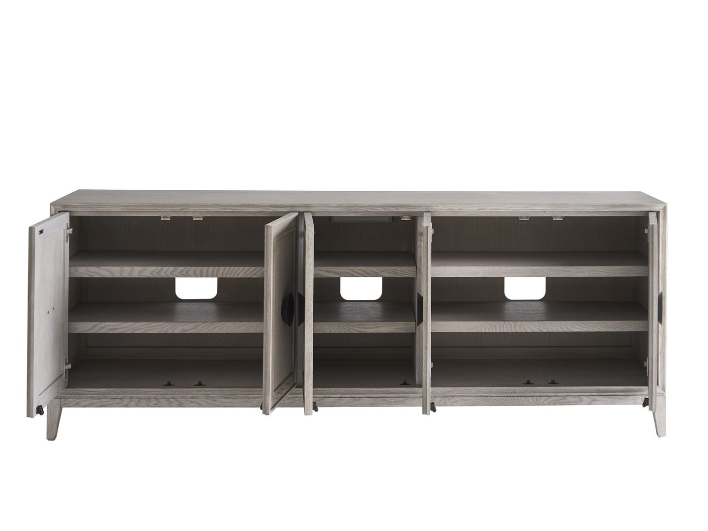 The Coalesce Entertainment Credenza is a confluence of style and utility, boasting generous interior storage complete with four adjustable shelves. Clad in a serene Rolling Fog finish and accented with faux linen texture doors, the piece is defined by circular, slightly oversized metal pulls that lend a trendy, dynamic flourish to this sophisticated organizer.
