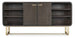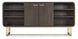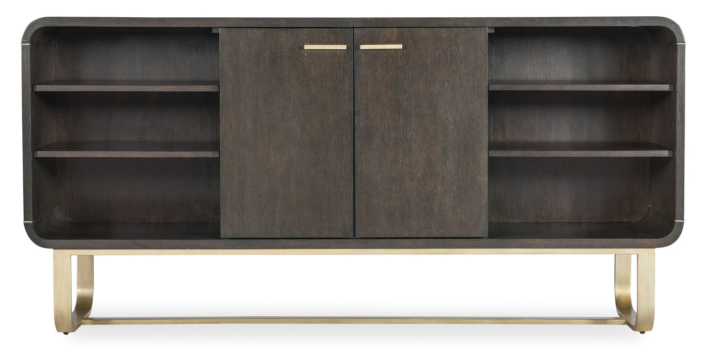 A sleek gold metal base and accents combine with a dark finish over Oak Veneers to create the chic and multi-functional Metropolitan Credenza. Use it as a bookcase, entertainment center, storage piece, entry piece or serving piece. There’s one adjustable shelf behind the pair of center doors, two adjustable shelves on the left and right sides, and the back panel behind the doors has ventilation and wire management. Measures 74 W x 19 D.
