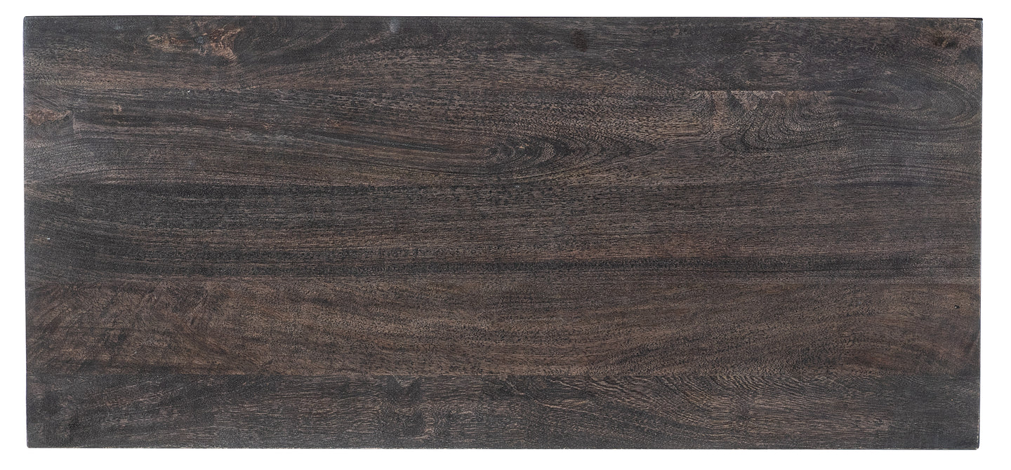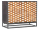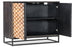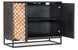 - Finish: Black rustic finish on the exterior with contrasting natural mango and bone weave design on door fronts. Black iron base.