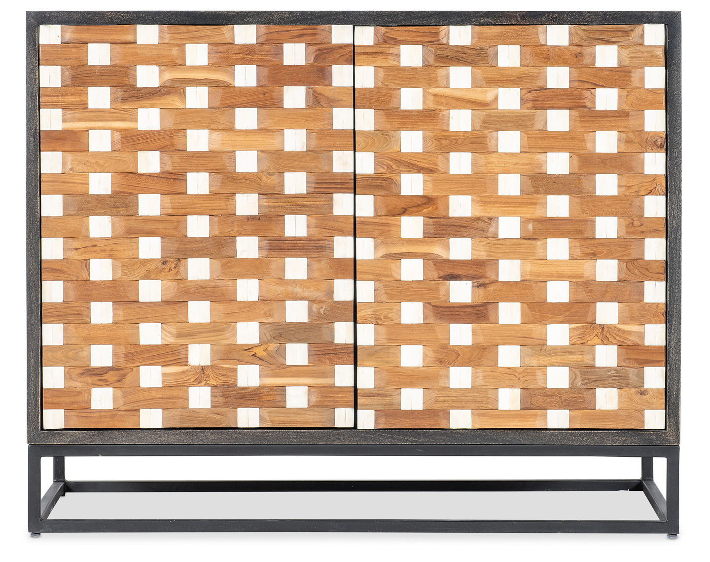 The organic chic Weaver Chest contrasts a natural Mango and bone-colored weave on the door fronts. Featuring a tribal flair, the exterior case has a black rustic finish complemented by a black iron base. Behind the doors is one adjustable wood shelf. 36 inches wide.