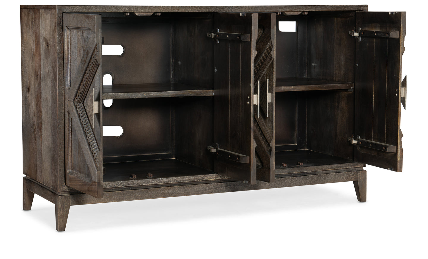 The Commerce & Market Carved Chest combines a tactile and rustic case in Mango Wood and hammered pewter hardware with a classic raised diamond pattern motif on the four doors. There’s one fixed wood shelf behind each pair of doors. Ventilated back panel.