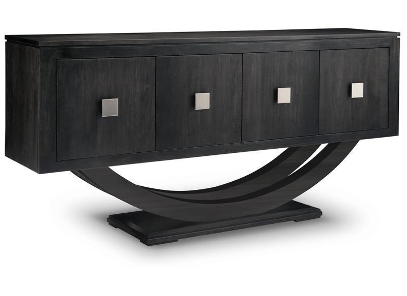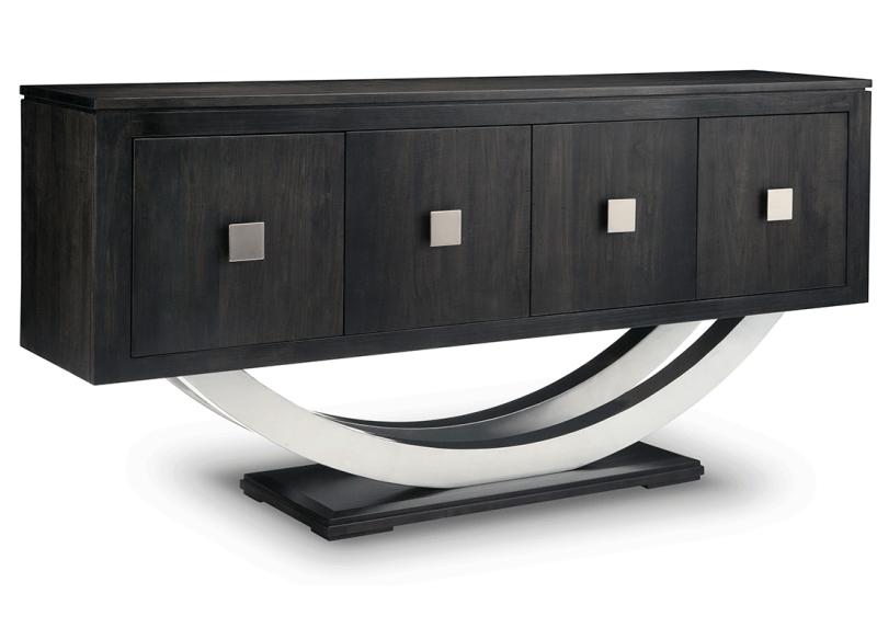 The Contempo Pedestal Sideboard with Metal Curves combines spacious storage with distinctive contemporary styling. Decorative metal curves accent the pedestal base, adding a unique design element. Four doors open to reveal adjustable shelving that allows you to customize storage for a variety of dining and household items.