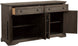 Specifications: Made of acacia veneer, wood and engineered wood. Wire-brushed powder glaze oak finish. 2 dovetail drawers with metal on metal center glides. 2 storage cabinets each with an adjustable shelf. Dark bronze tone knobs and bar pulls. No assemble required. Prop 65 Information.