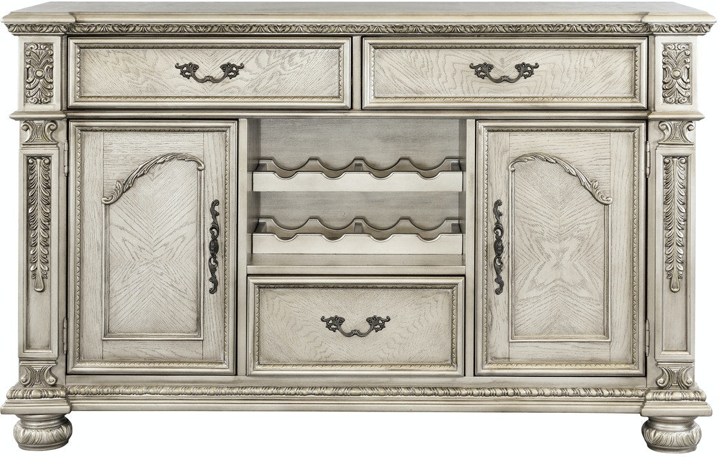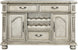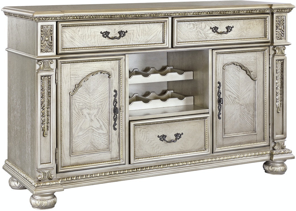 Product Description: Old-World European styling is captured in the dramatically elegant Catalonia Collection. Traditional design elements reign at every turn - egg and dart molding, acanthus leaf carving, bead molding, gold tipping and extravagant carvings - creating a sophisticated look for your dining room. Each drawer front of the server features dark bronze fixed-drop hardware with decorative flourish that furthers the elegant appointments that embellish this collection. A traditional platinum gold finish is utilized to highlight the oak veneer.