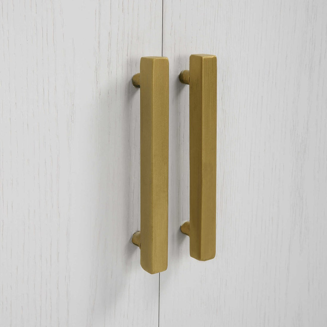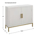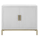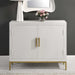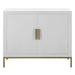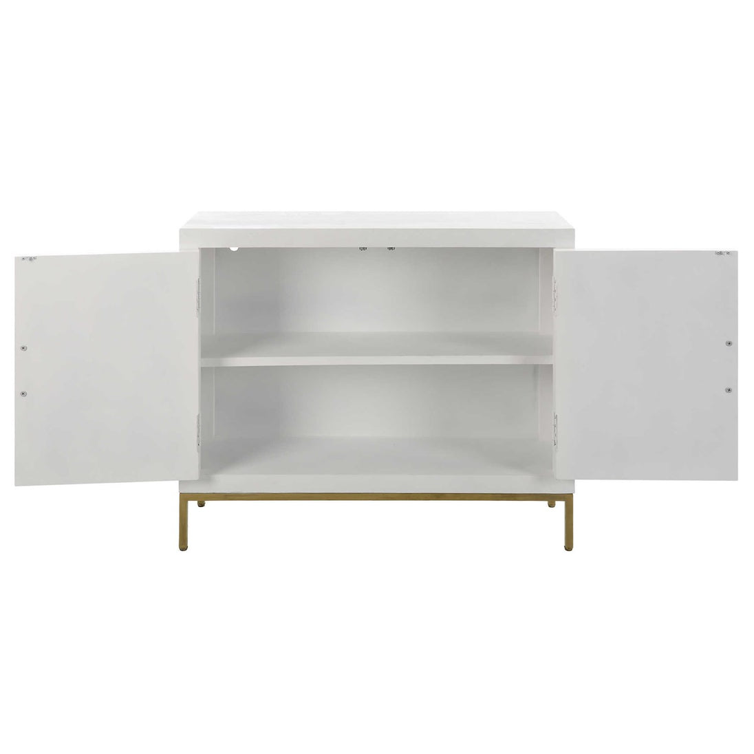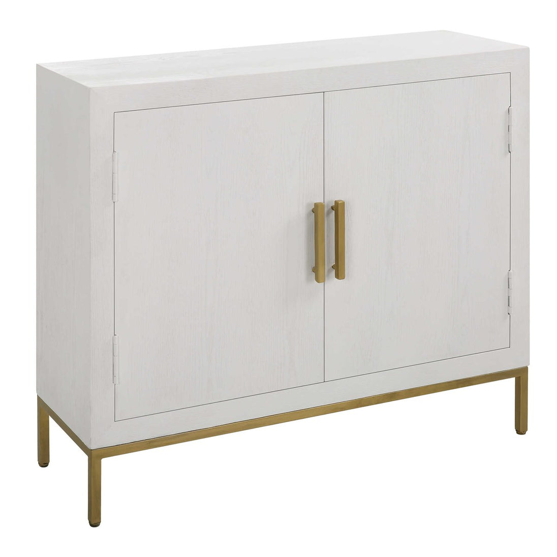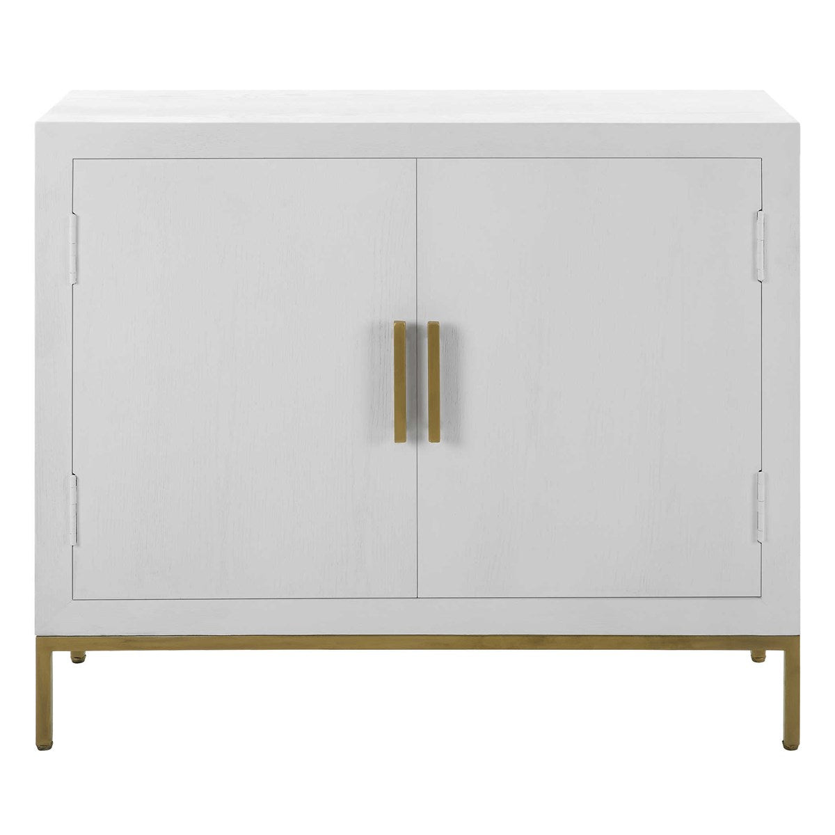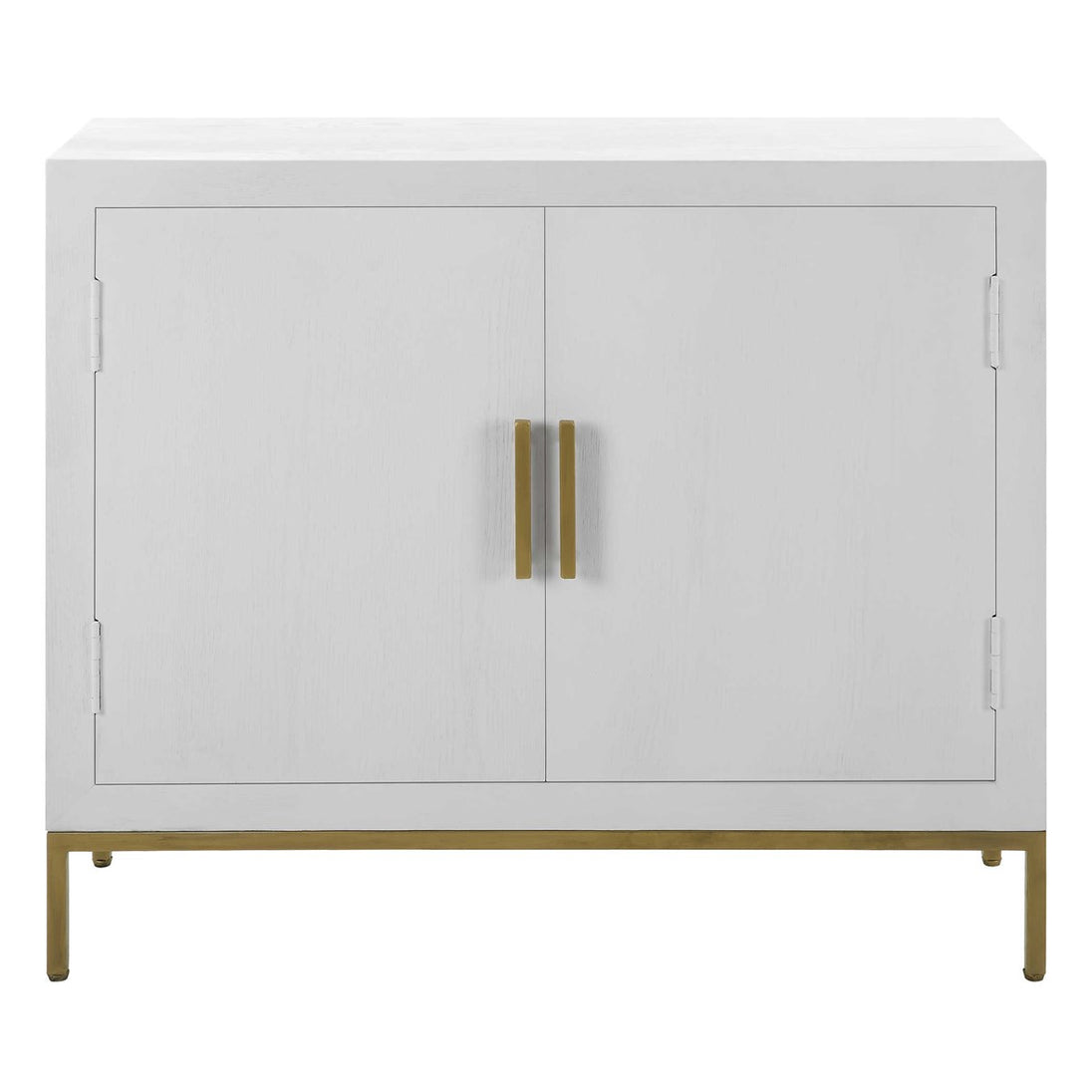 The Front Range Cabinet's streamlined design and classic finishes make it a perfect addition to virtually any space. The exterior is oak veneer with a painted white finish, accented with aged gold iron. Has one interior fixed shelf.