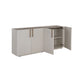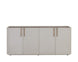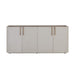 This contemporary sideboard is defined by its beautiful and gentle curves. Upholstered in cream faux leather with a brown oak veneer tabletop that is sure to impress. Includes four cabinets and completed with a rustic bronze steel base. Coordinating console table, desk, and media console and cabinet also available. Handle With Care: This design has been crafted with faux leather. Faux leather is manufactured to reflect the natural characteristics of leather; as such, colour variations, markings wrinkles, grooves, and light scratches are appreciated characteristics. No two pieces will be alike. Visit our Product Care page for more information on how to ensure the lasting beauty of this piece.