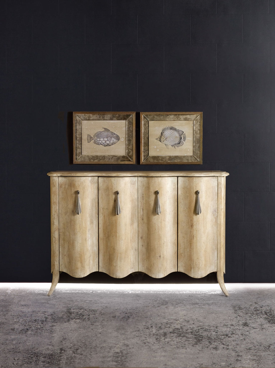 Curvy and couture, the swanky Draped Credenza has a fashion flair with its tassel-like hardware, shaped front and apron and delicate cabriole legs. Crafted of Elm Veneers in a light wood finish, the piece has two sets of doors with one adjustable shelf behind each pair of doors. The ventilated back panel accommodates media usage.