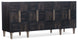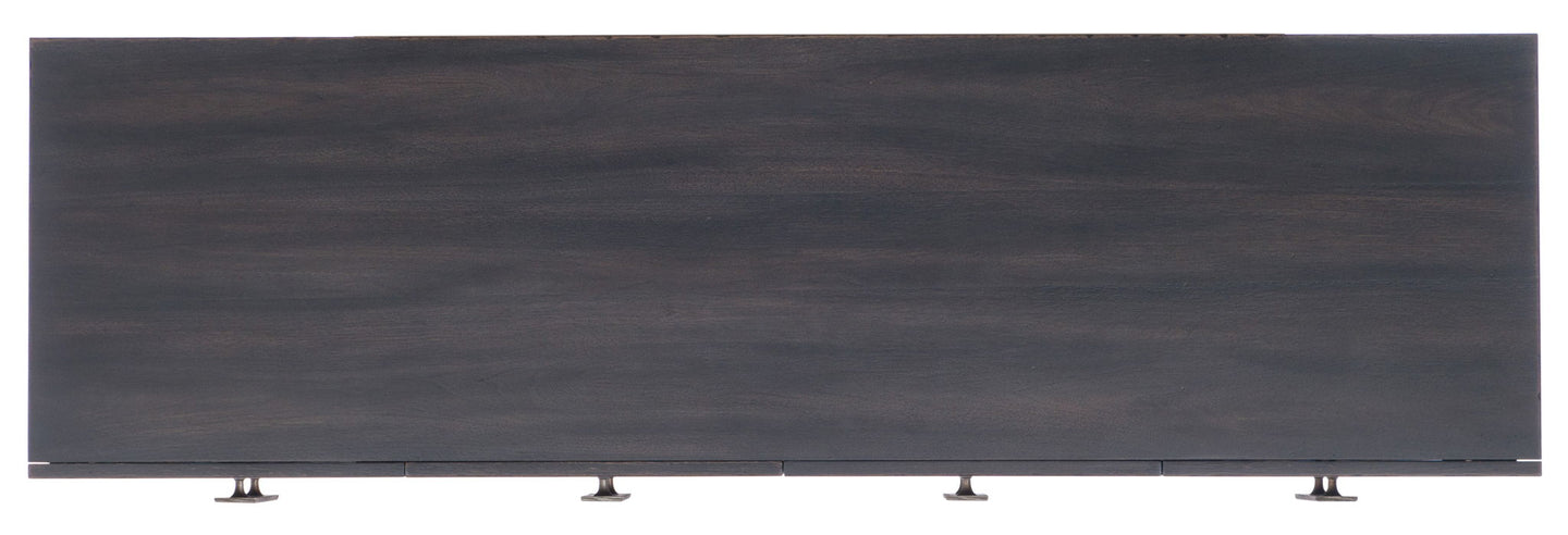 Dark and handsome, exotic and elegant, the Neville Credenza is earthy in its beauty, crafted of fancy Walnut Veneers with a dark walnut finish accented with textured pewter metal hardware. Four doors with one adjustable wood shelf behind each pair of doors. The ventilated back panel behind each pair of doors and wire accessibility make this piece electronics ready.