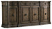 The soaring design of the grand 96-inch Rhapsody Credenza will lift your spirits and elevate the atmosphere. Romantic scroll motifs around the apron, column motifs on the case front and a rope-twist carving around the base give a classical pedigree to the piece. The walnut-colored finish inspired by the rustic nature of reclaimed woods in beautiful patinas makes the credenza fresh for today's relaxed interiors. The multi-functional credenza has three drawers and a drop-front center drawer and four doors with one adjustable wood shelf behind each and one adjustable shelf behind the center doors.