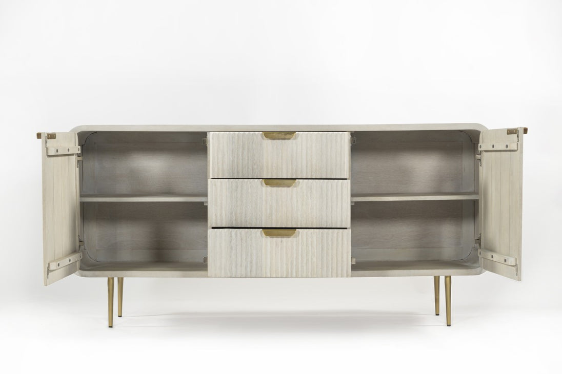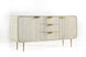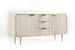 Introducing the Riverside Storage Cabinet in White—a contemporary and functional storage solution that combines form and function in one sleek package. This storage cabinet offers ample storage space while adding a touch of elegance to your living space. The Riverside Storage Cabinet is constructed from solid mango wood, known for its durability and distinctive grain patterns. The white finish enhances the natural beauty of the wood, creating a clean and fresh look that complements any decor style. The solid construction ensures longevity, making it a reliable storage solution for years to come. Featuring three spacious storage drawers and two storage cabinets, the Riverside Storage Cabinet provides plenty of space to keep your belongings organized and tidy. The brushed gold finished accents on the drawers and cabinets add a touch of sophistication and elevate the cabinet's contemporary aesthetics. Whether you need to store books, decorative ornaments, or other household items, the Riverside Storage Cabinet is the perfect solution. Its clean and modern design makes it a versatile addition to any room in your home, from living rooms to home offices. The ample storage space and elegant design make it a functional and stylish storage solution for any modern home. Elevate your storage game with the Riverside Storage Cabinet and indulge in the perfect blend of contemporary styling and functional design.